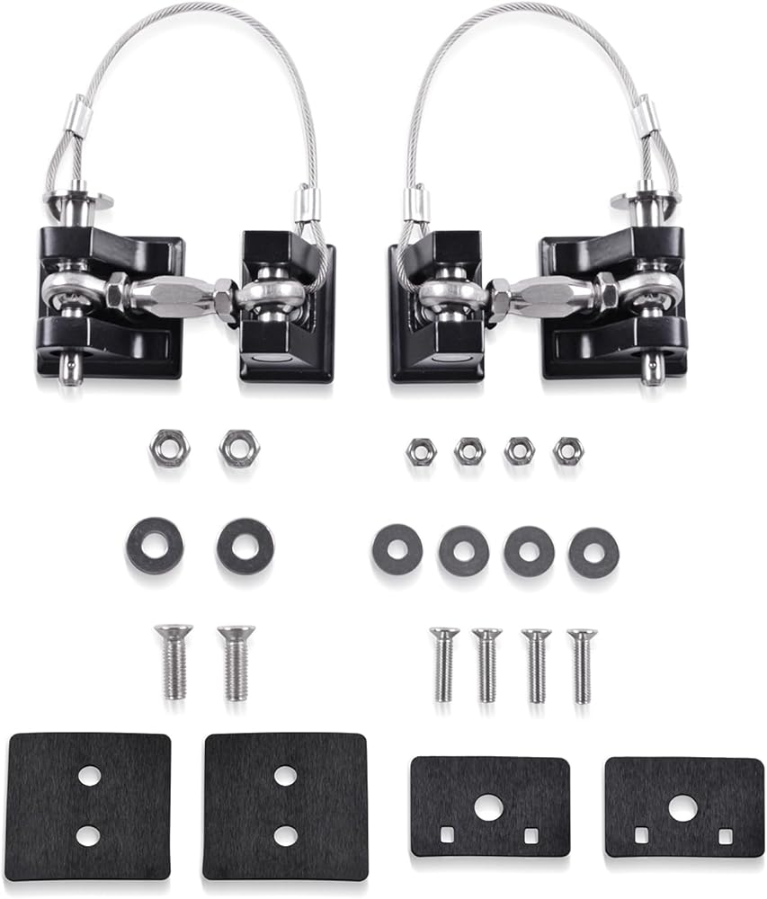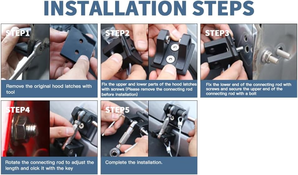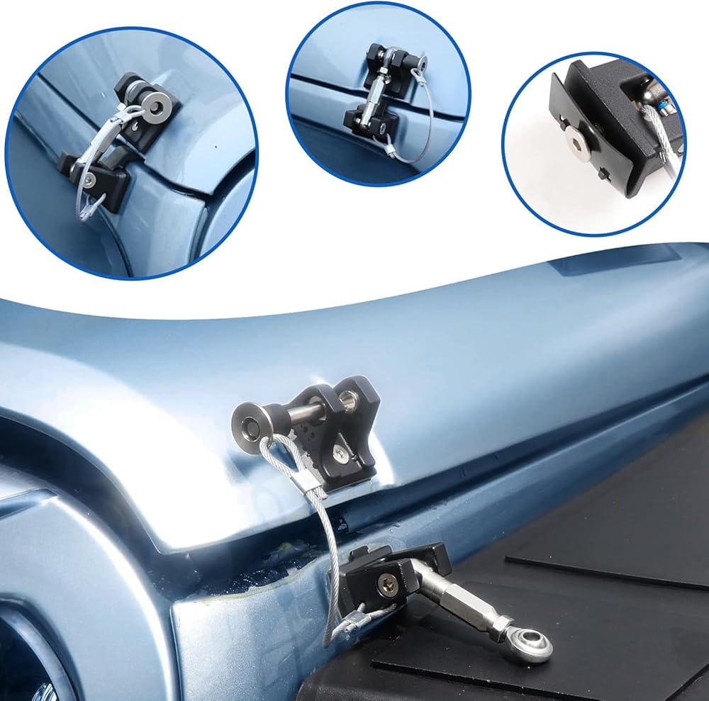 🚘【GOOD MATERIAL】: Made of die-cast electroplated stainless steel and high-strength aluminum alloy. Excellent heat resistance and scratch resistance. Keeping your hood in place even on harsh terrain, reducing hood tremors.