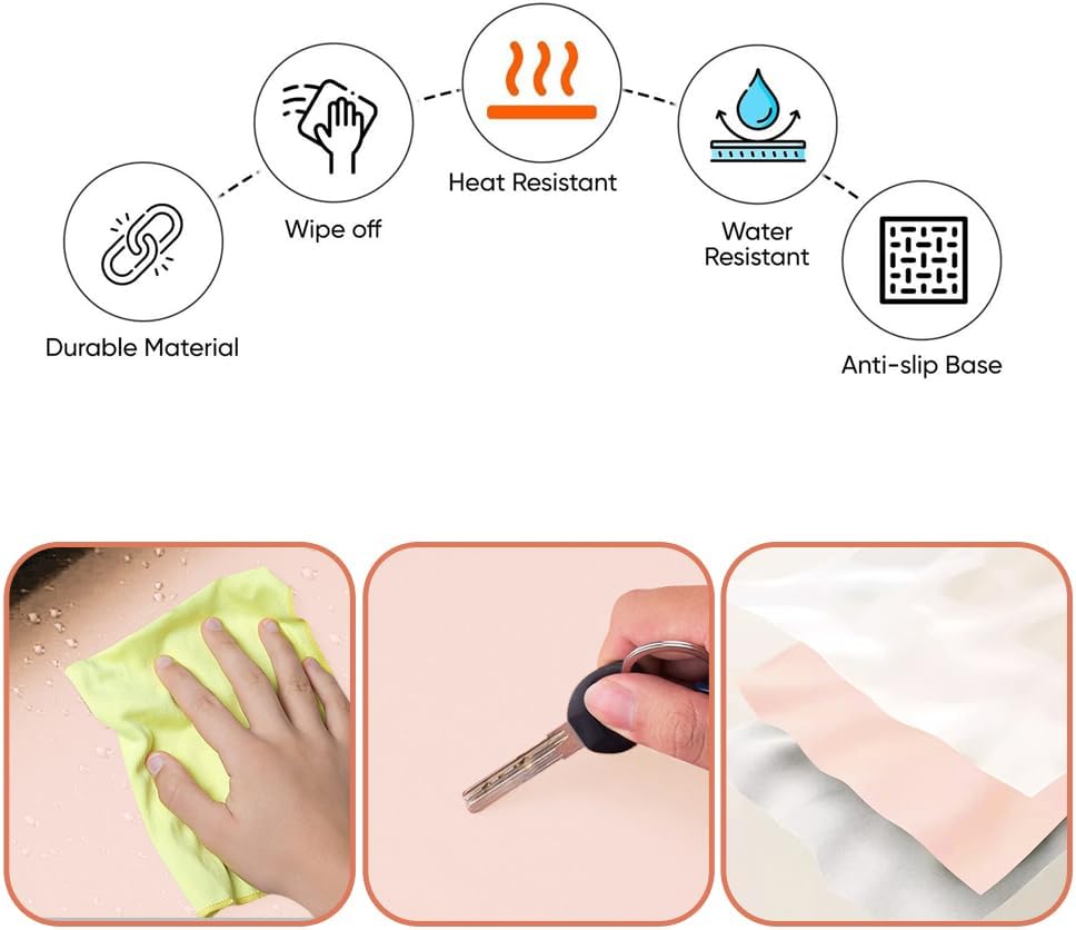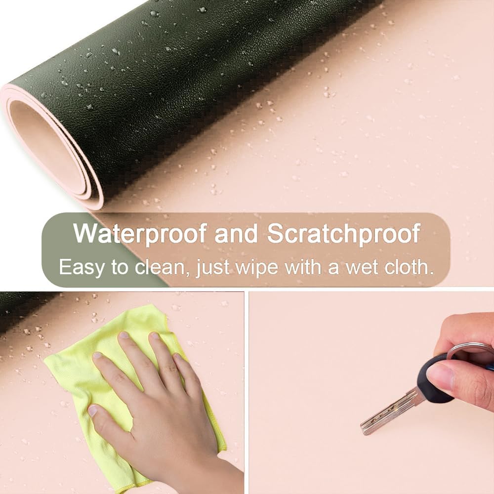 【EASY TO CLEAN】Water-resistant and heat-resistant material makes this desk cover durable and easy to clean. When it gets dirt, you can wipe clean easily with a wet cloth or eraser. Our vanity mat protector is perfect for protecting your vanity top from liquids damage and stains.