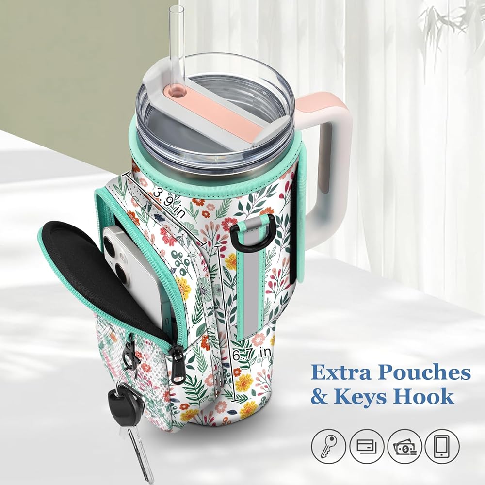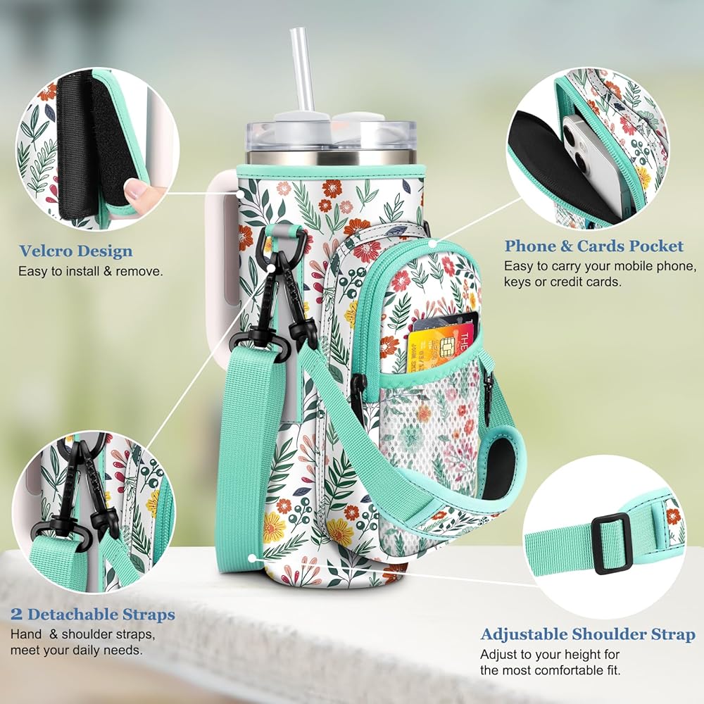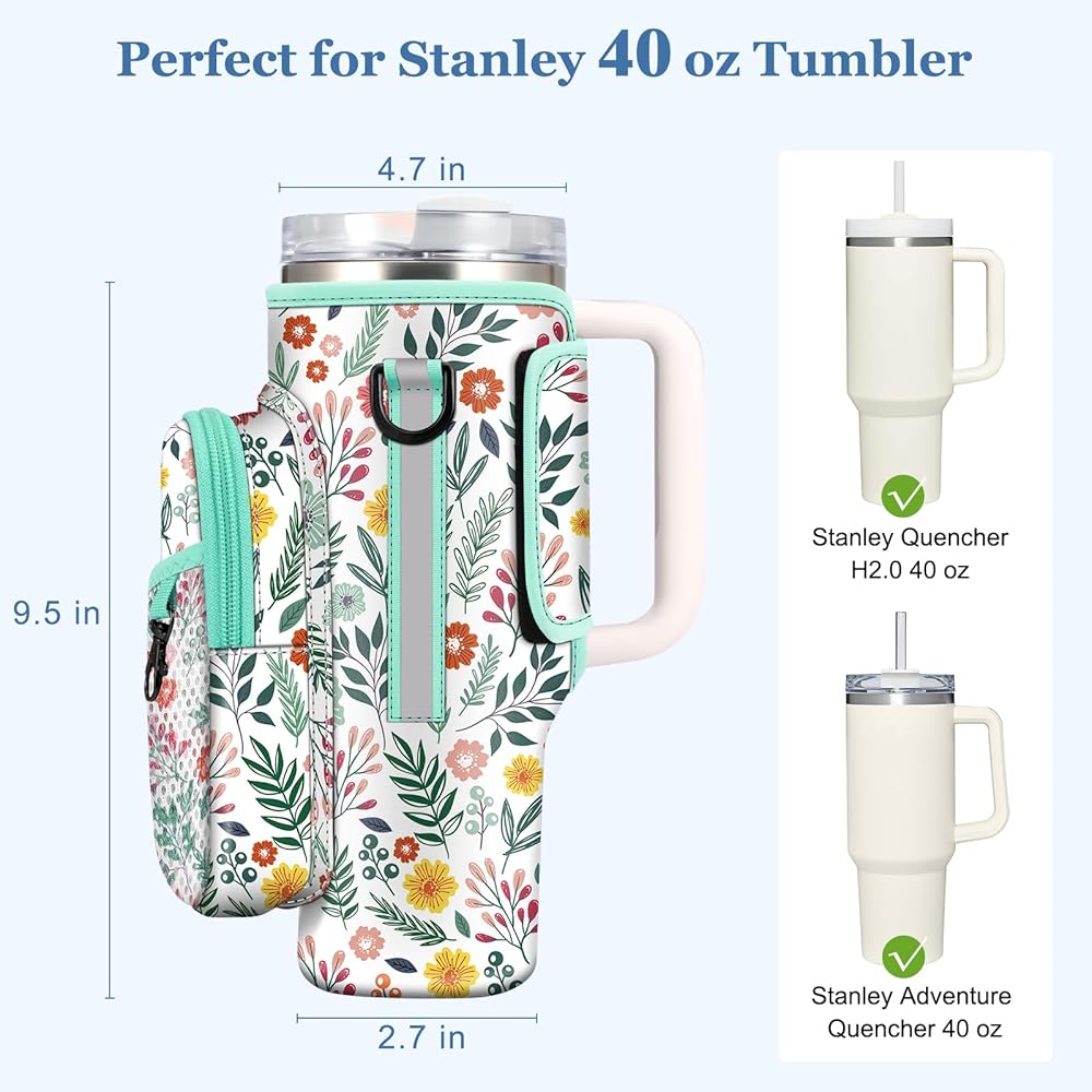 CaseBot Water Bottle Carrier Bag with Phone Pocket for Stanley 40 oz Tumbler with Handle, Neoprene Water Cup Holder with Adjustable Shoulder Hand Strap for Hiking Camping Travelling, Spring Bloom