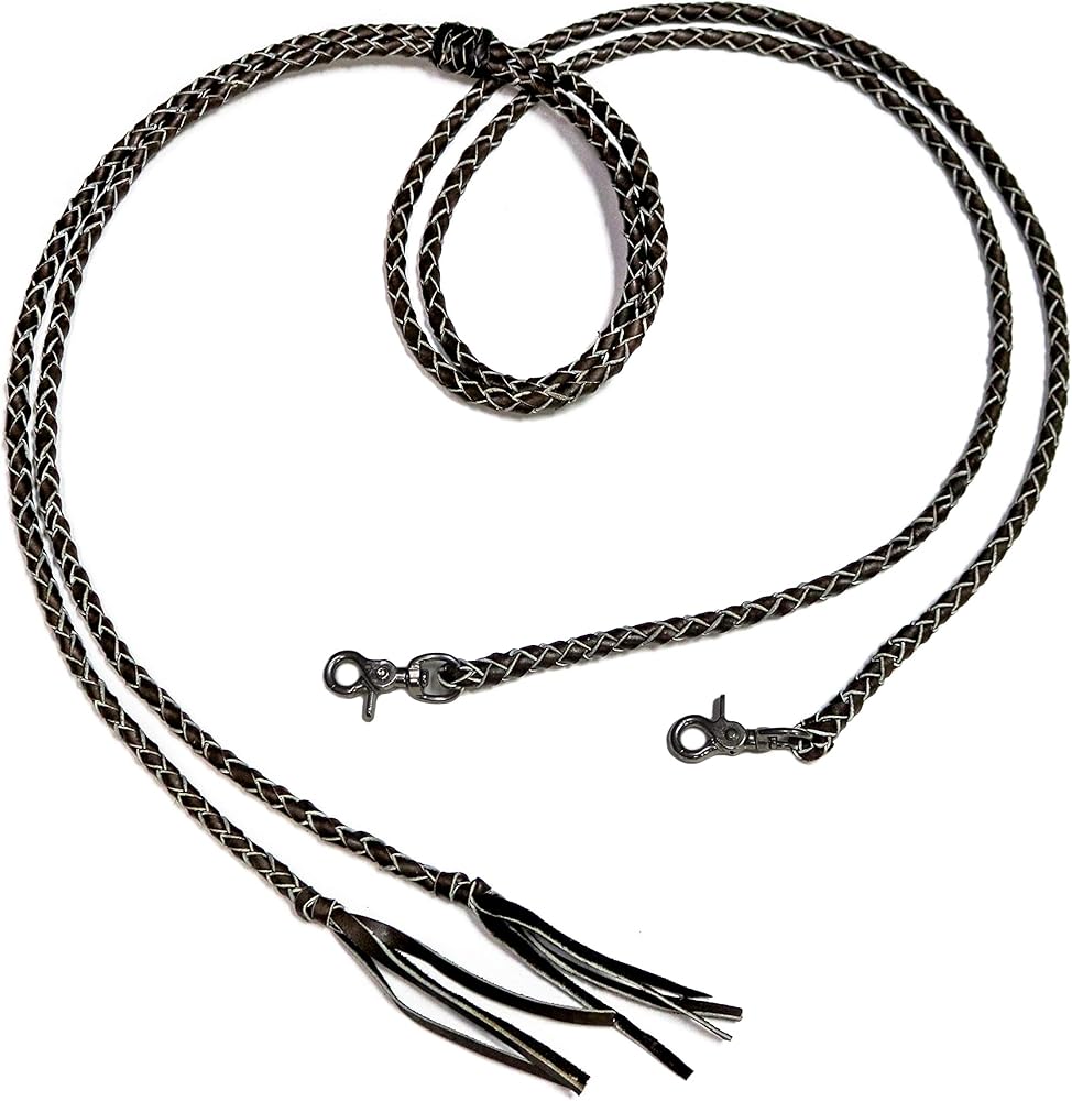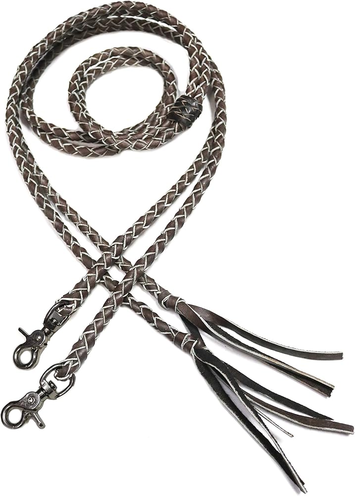4 Plait Braided Leather with Nickel Plated Snaps. Approximate Length 7' x 3/8". Trigger snap bit ends and tassel rein ends and is easy to grip.