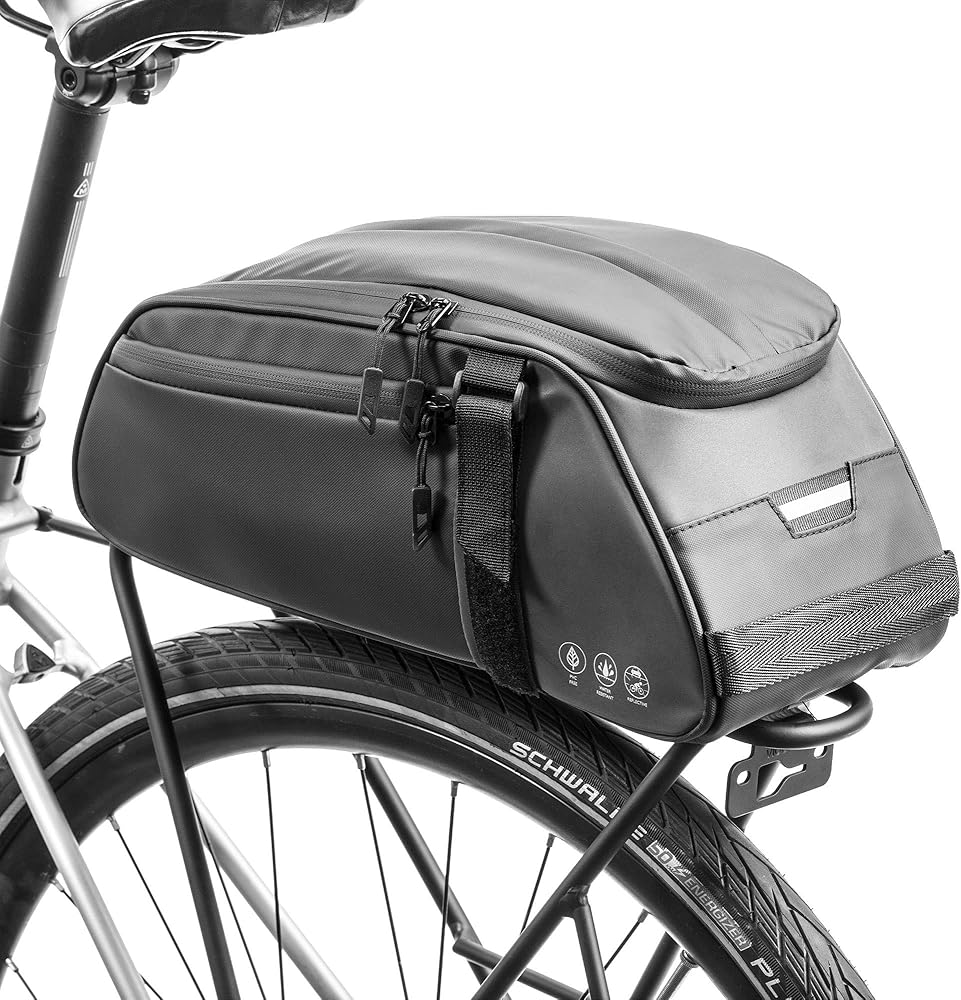 🚲 MATERIAL --- Made of 600D oxford fabric + PU, PVC free, this bicycle rack bag is water repellent, wear-resistant and durable.