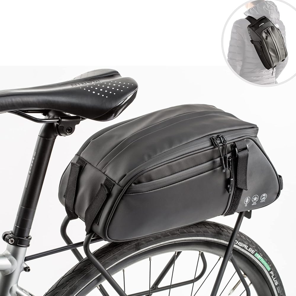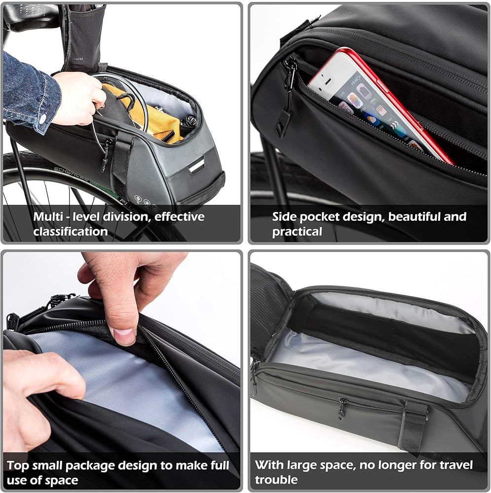 🚲 USING METHODS --- When attached onto the bike rack, this bike rear seat bag can be used as a waterproof bike bag. With the hidden and adjustable shoulder strap, the cycling trank bag can be used as a daily chest Pack.