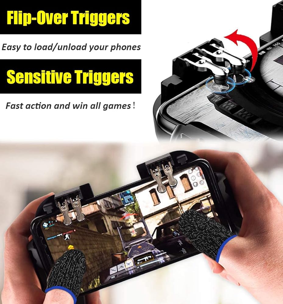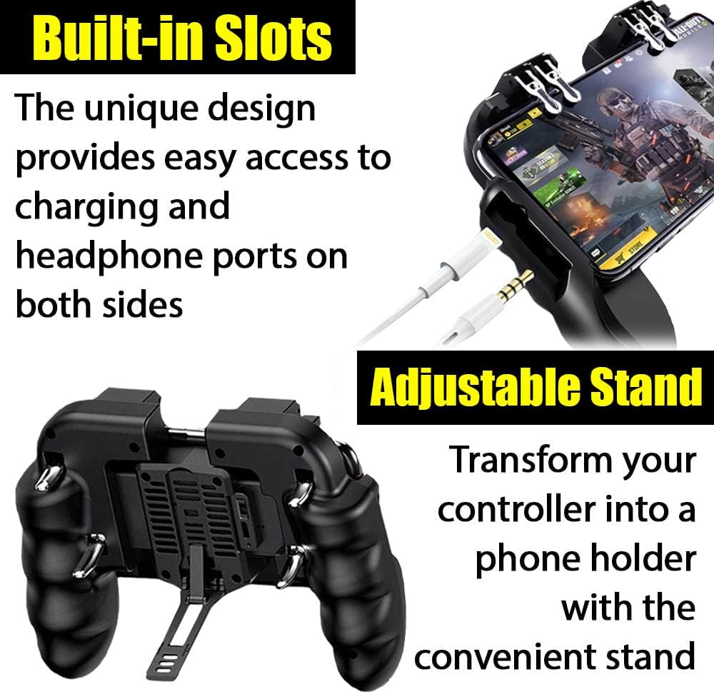 ✅🎮UPGRADED 8-IN-1 BUNDLE - The gaming controller combined with gaming L1R1 L2R2 triggers, phone cooling fan, adjustable phone stand, a charging cable, finger sleeves, bonus replacement touchpads and a FREE PUBG Key Ring provides the ultimate mobile gaming experience.