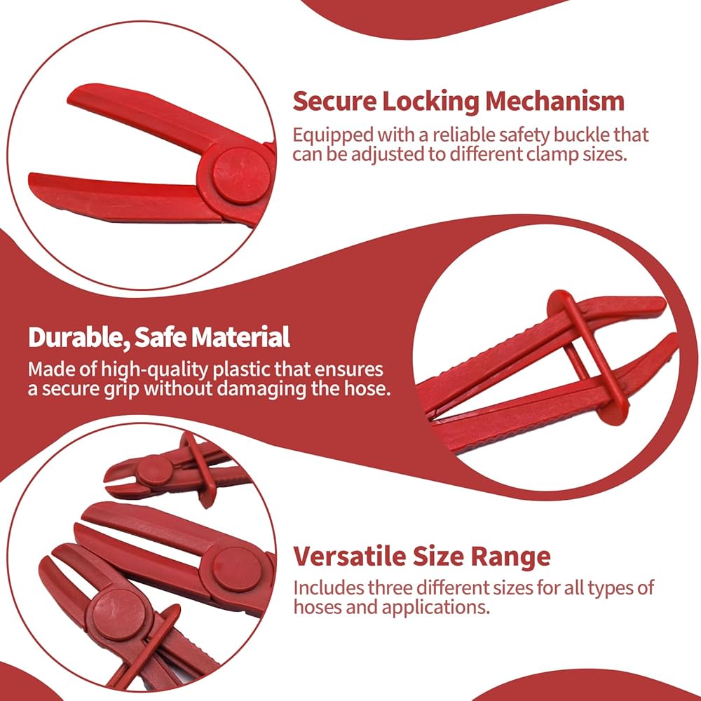 Size Options: The 3PCS set includes pliers in small (155mm), medium (185mm), and large (255mm) sizes. These Hose Pinch Clamp Pliers effectively grip hoses ranging from 0 to 65mm in diameter, ideal for various coolant hose clamp and fuel line tasks.