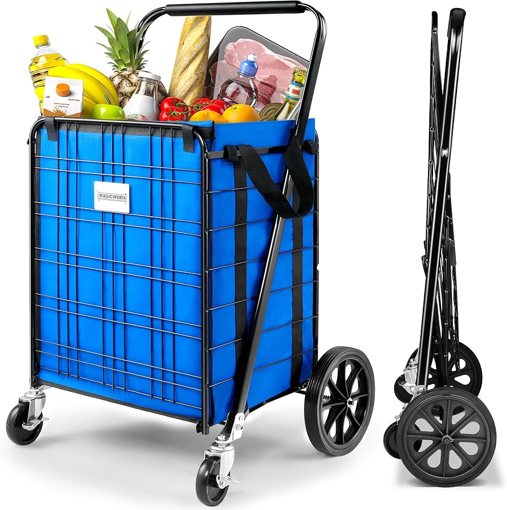 【SIMPLE ASSEMBLY & COMPACT DESIGN】Assembling our folding shopping cart is a breeze—no tools needed. Installing wheels and axles is a snap. Fold and unfold effortlessly in just seconds, making it easy to transport and store, ultimately saving space. Ideal for convenient storage in your trunk, garage, or laundry area.