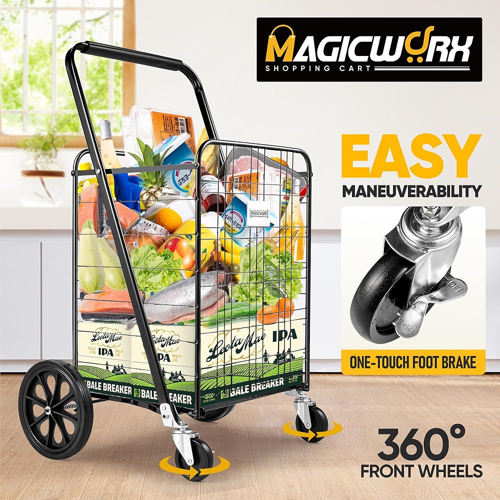 【360°SWIVEL FRONT WHEELS WITH ONE-TOUCH FOOT BRAKE】Experience effortless navigation with our shopping cart's front wheels featuring a 360° swivel function, enjoy seamless movement in any direction for a smoother and more convenient experience. Maneuver effortlessly and secure your utility cart in place with just a simple foot press.