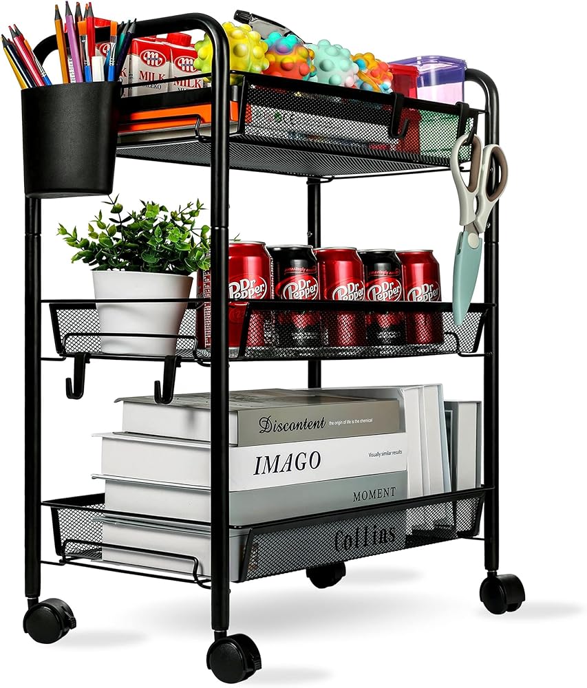 3 Tier All-Metal Rolling Cart, Trolley Craft Cart with Locking Wheels, Easy-Carry and Assembly Mesh Trolley Cart with 1 Small Baskets and 4 Hooks for Bathroom Kitchen Office Balcony Living Room