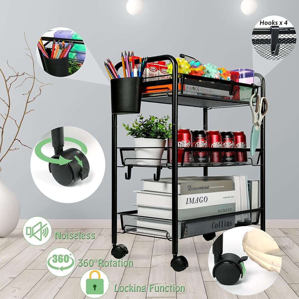 【Multiple Storage Spaces】In addition to being equipped with 3 independent sturdy and practical trays, utility carts also equipped with 1 hanging basket and 4 hooks to add more storage space.
