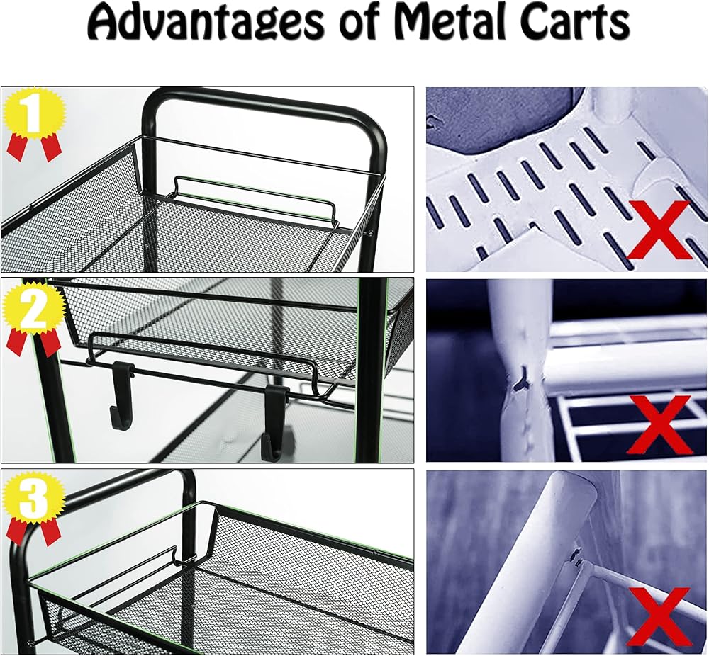 【Durable All-metal Rolling Cart】Our all-metal rolling cart with a classic metal design, it is definitely more durable, sturdy, stable and safer than plastic. Rolling carts hold 66lbs-105lbs and each basket holds 22lbs-35lbs, 50% better than mesh carts of the same type.