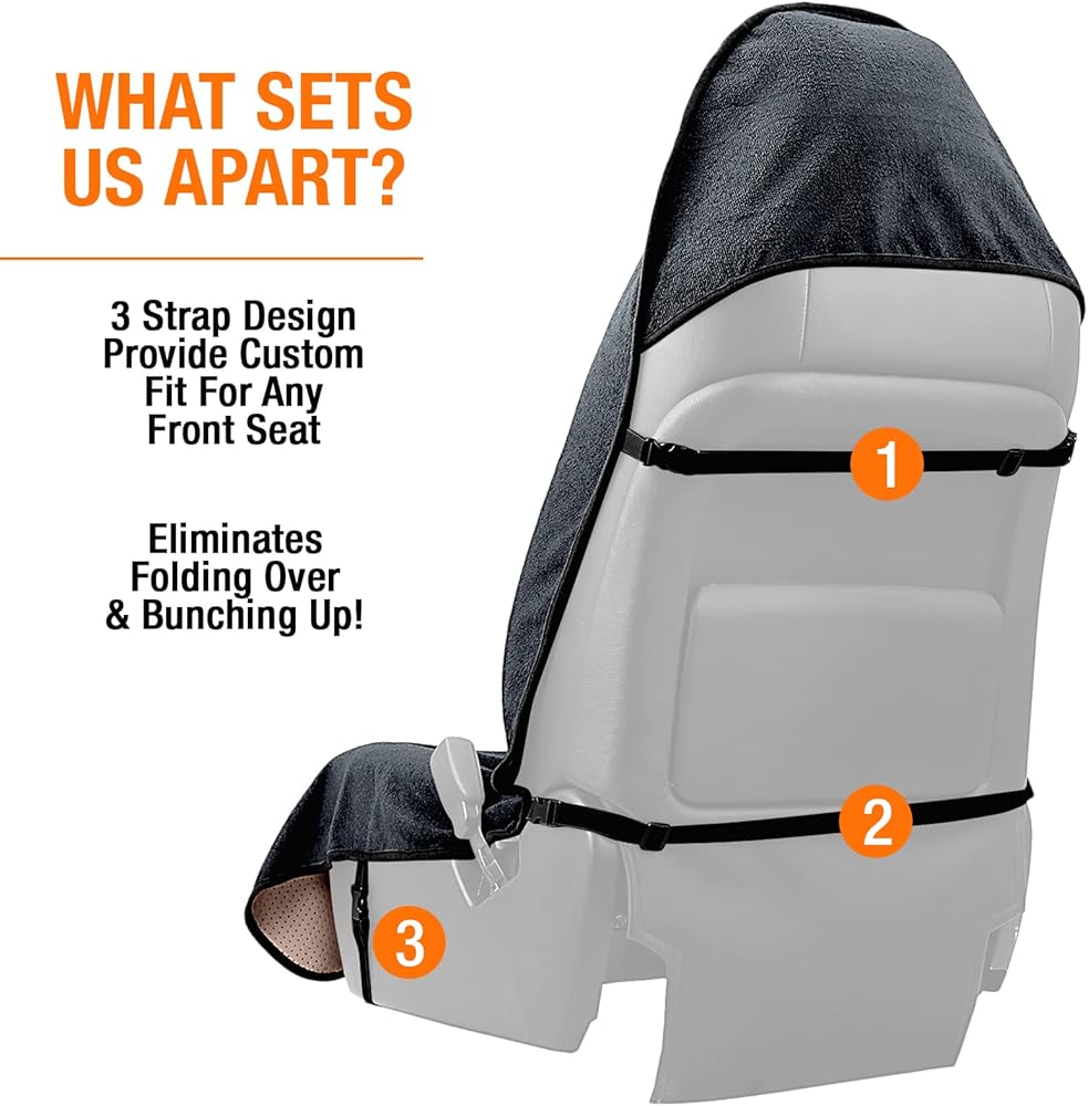 Our towel Seat cover includes quick storage convenient front pocket for quick grab items; Our car seat towel is universal fit for all car truck suv van rv tractor seats - using the adjustable 3 strap mounting system towel seat cover adheres to any seat