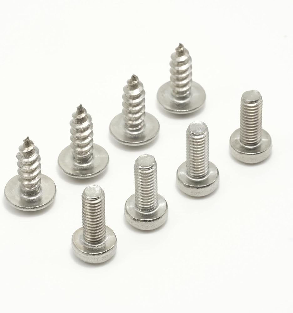 A complete set of rear license plate replacement screws for your Mazda All Models. Two sets of metric screws, eight screws in total. Four short stainless black machine screws and four long stainless black self-tapping sharp pointed screws.