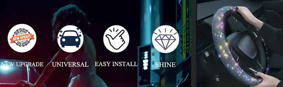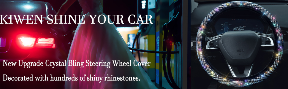 1.Upgrade Crystal Steering Wheel Cover:This New Crystal Bling Steering Wheel Cover made of durable flannel material, it is decorated with hundreds of shiny rhinestones.