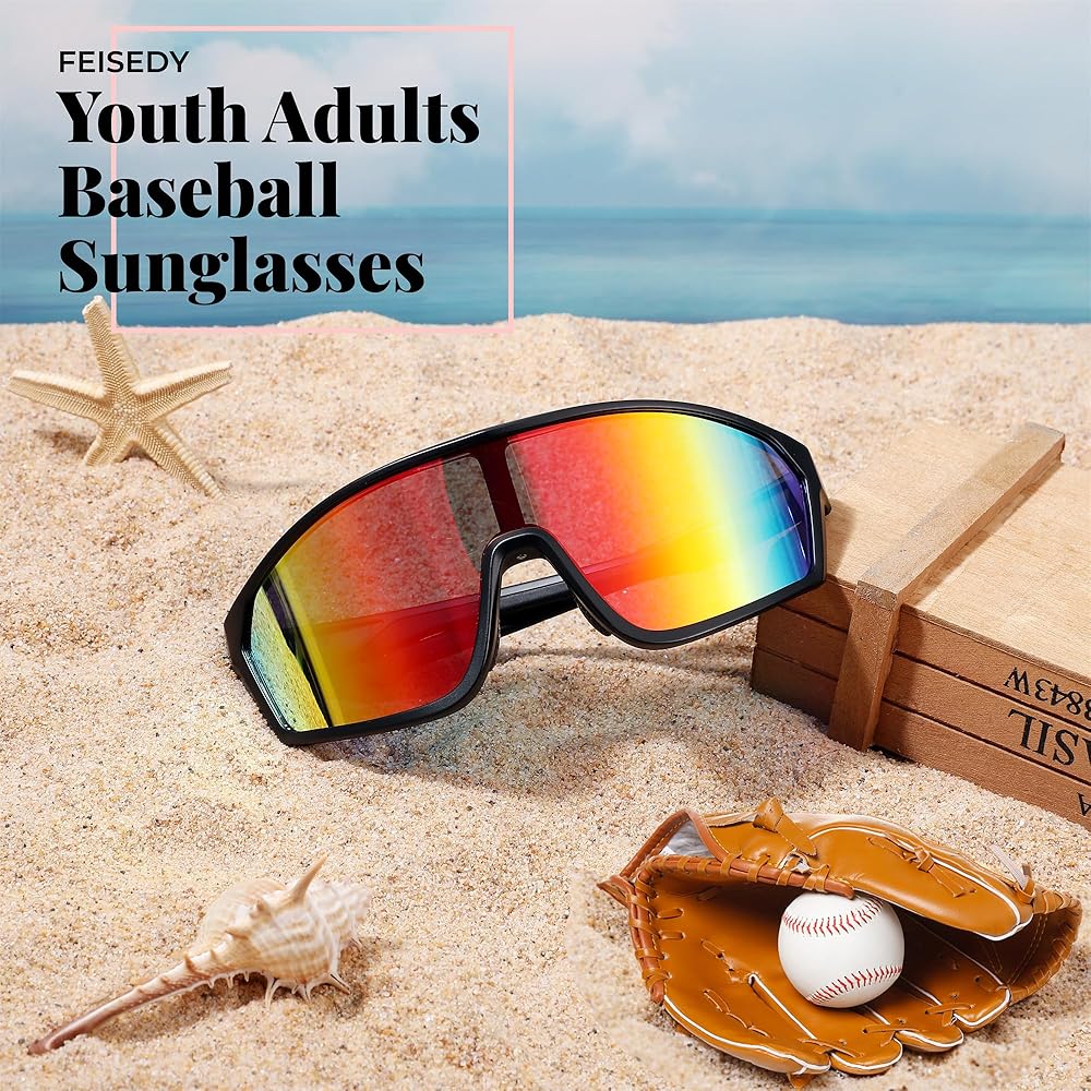 【FEISEDY Sports Sunglasses】 Baseball sunglasses use a one-piece design and mirrored lenses to highlight the stylish design. Cycling glasses are specifically designed to effectively eliminate and filter the scattered light in the beam, making the view clear and natural, making the scenery look soft and not dazzling.