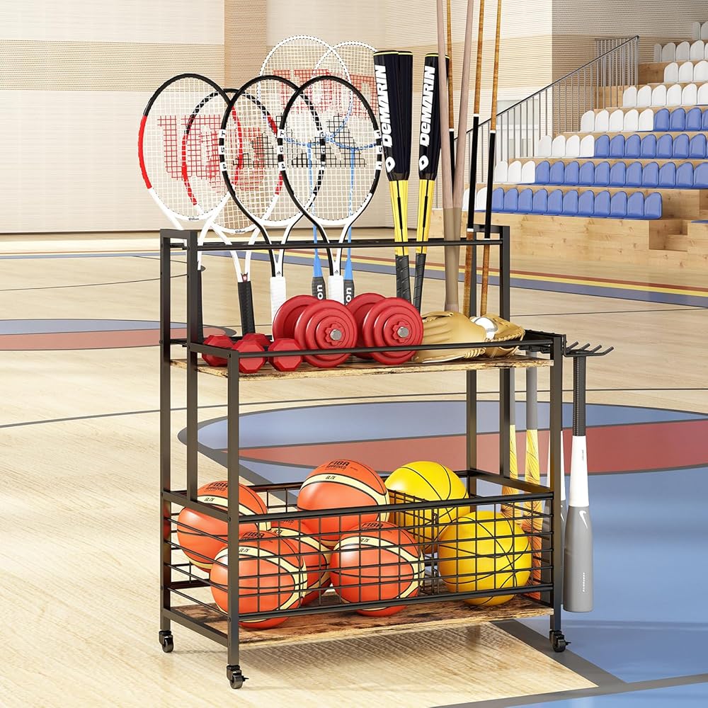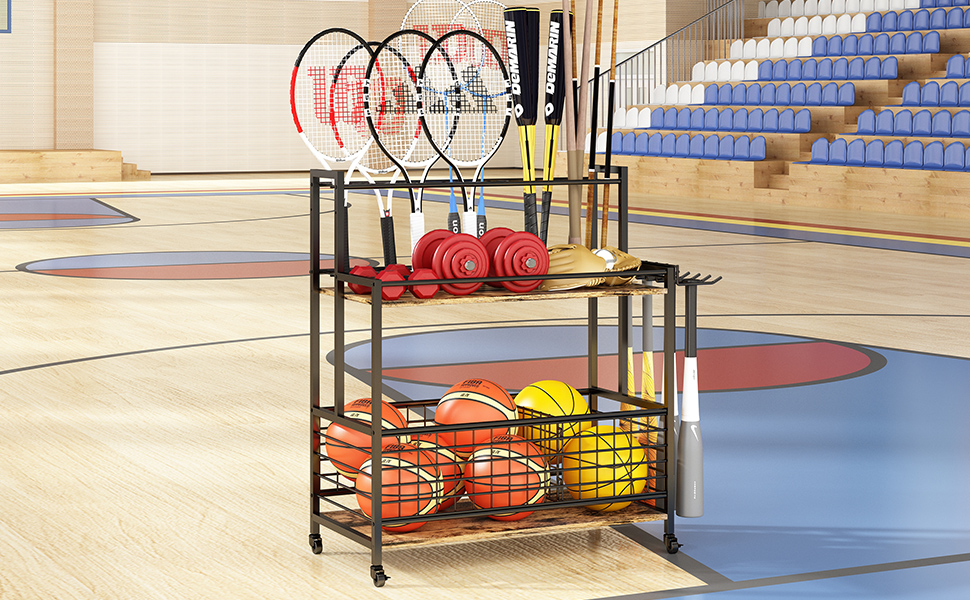MULTIFUNCTIONAL: This basketball stand can not only organize basketballs, footballs, and other balls. The top rack can organize fishing rods, pool cues, tennis rackets, badminton rackets, baseball bats, etc.