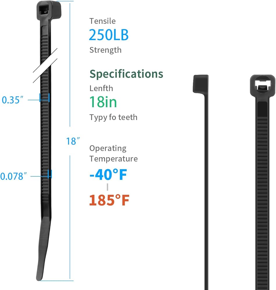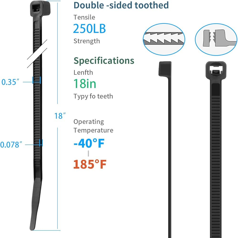 【Double Sided Toothed Design】Double Sided Toothed and Self-locking fastener design, sturdy and durable, with a strong Ratchet-Lock design and dense teeth are More Durable for use than ordinary 18”zip ties.