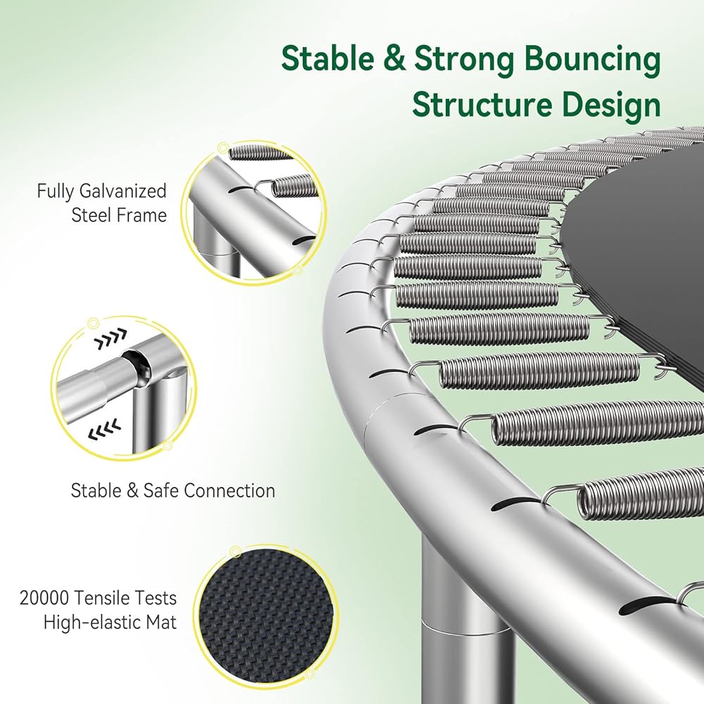 Excellent Structure and Materials: The mainframe of the trampoline is supported by high-quality galvanized steel, with a load-bearing capacity of 330lbs, anti-UV and anti-rust material can effectively deal with outdoor sun and rain. The top rails are fixed with T-joints to provide excellent stability, and the upgraded W-shaped leg assumes the sturdy base function.