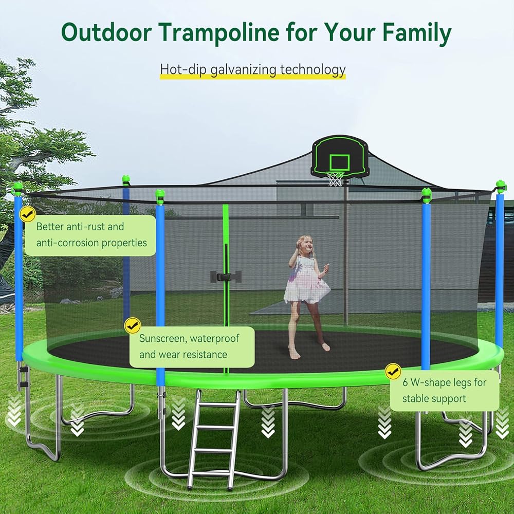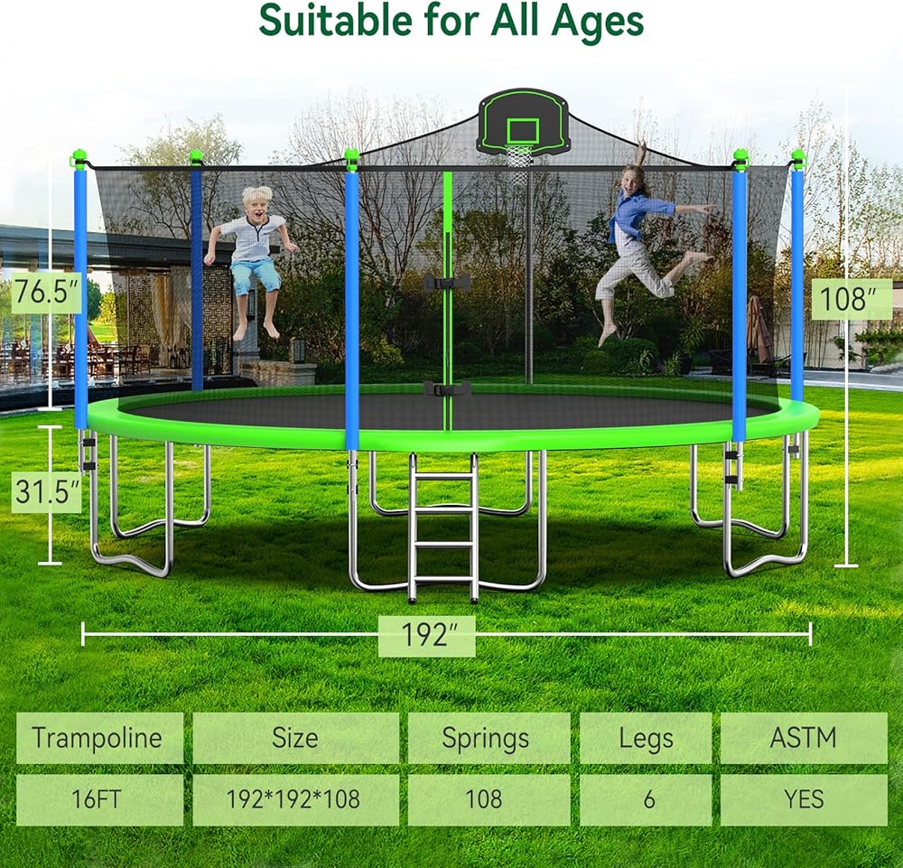 16FT Trampoline for Kids Recreational Trampolines with Safety Enclosure Net Basketball Hoop and Ladder, Outdoor Backyard Bounce for 6-8 Children and Adults
