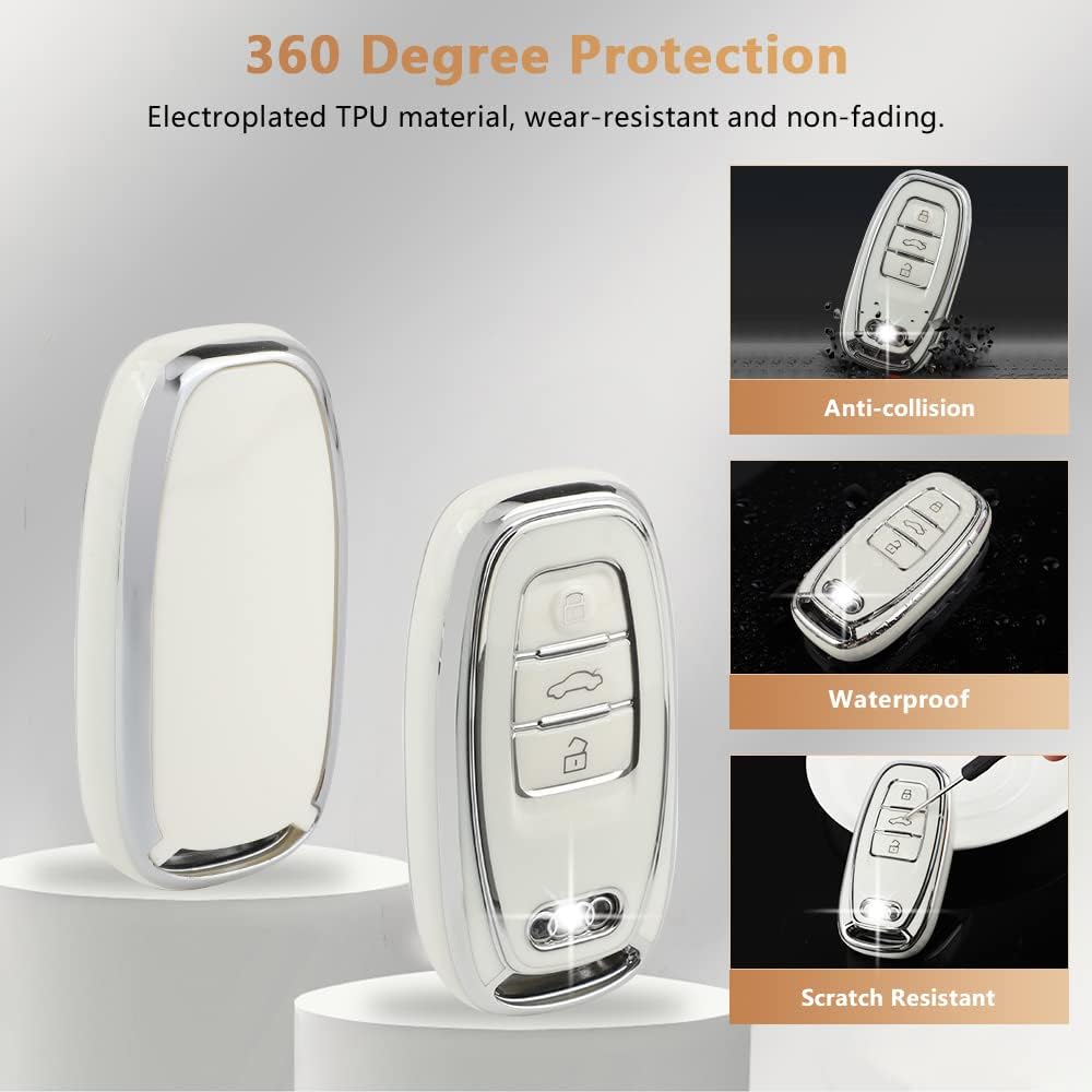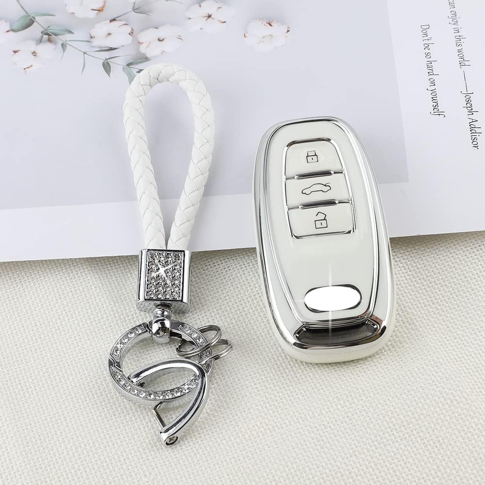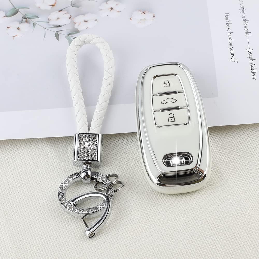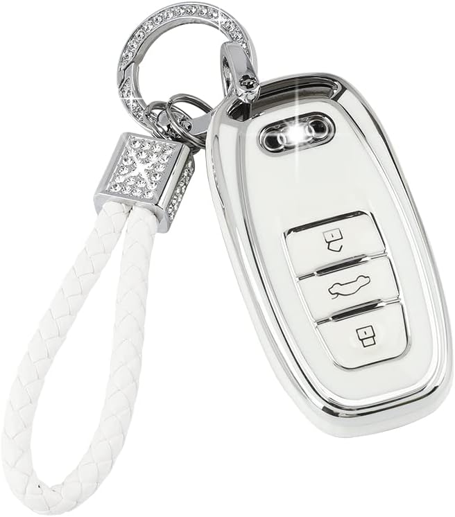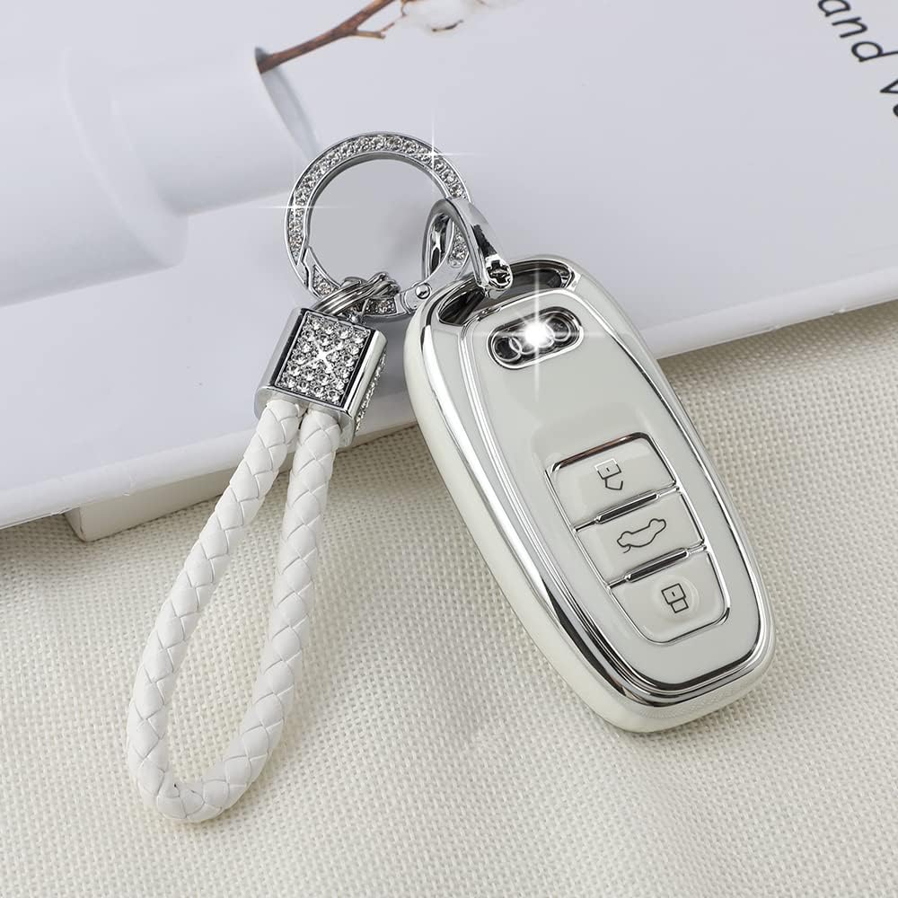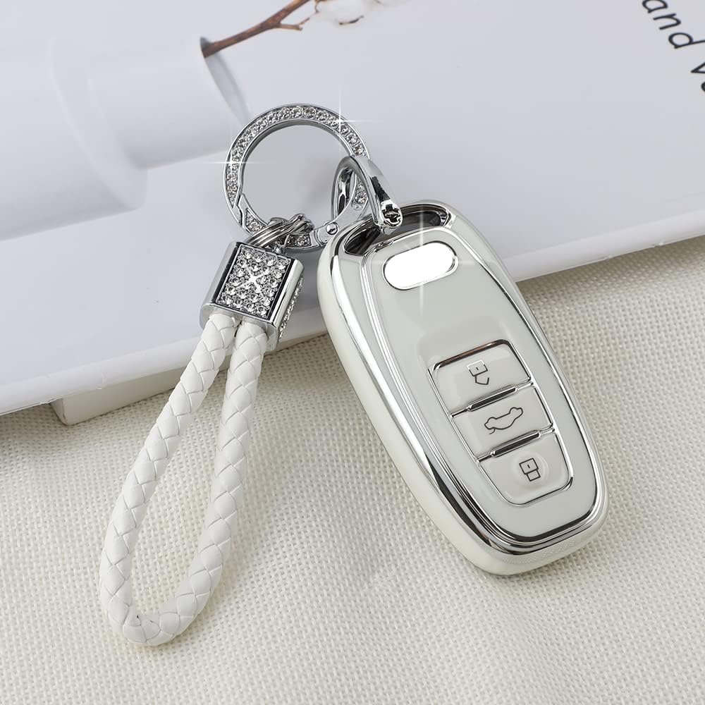 PIFOOG Key Fob Cover for Audi 4 Buttons TPU Soft Keys Case Shell Bling Keychain Car Accessories for Audi Q5 A4 A5 A6 A7 A8 RS5 RS7 S4 S5 S6 S7 SQ5 Girly Women White Silver