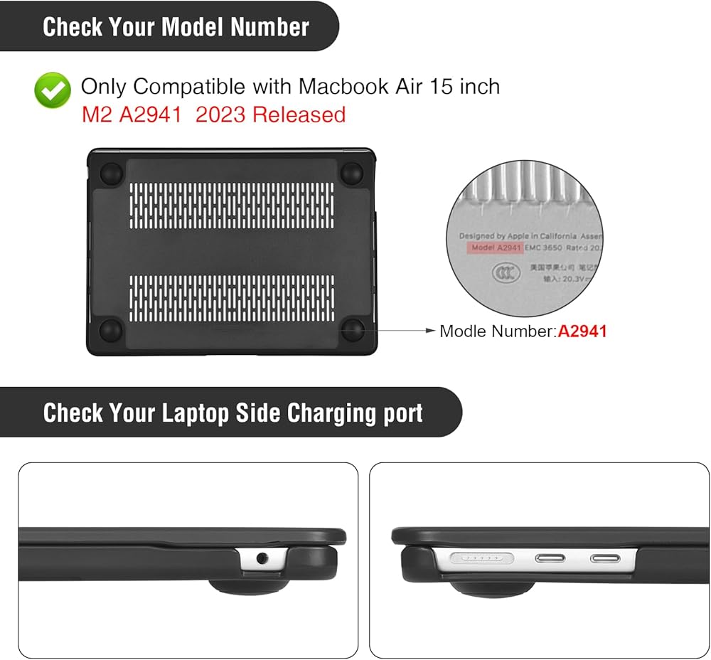 【Check Your Model】ONLY compatible with MacBook Air 15 inch Case 2024 2023 Release M3 M2 A3114 A2941, please kindly check the model number "AXXXX" on the back of the laptop before your purchase.