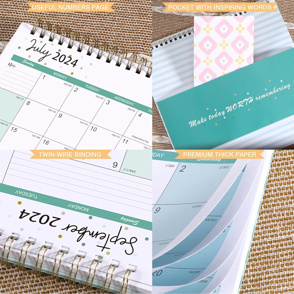🌈 QUALITY & EFFECTIVENESS - Thicker pages than normal 2024 calendar in the market to reduce ink leakage, erase fraying and shade issues + Mint thick board to stand steadily + Printed with high quality and well-balanced color ink. With this 2024 desk calendar, your life will be more productive and effective.