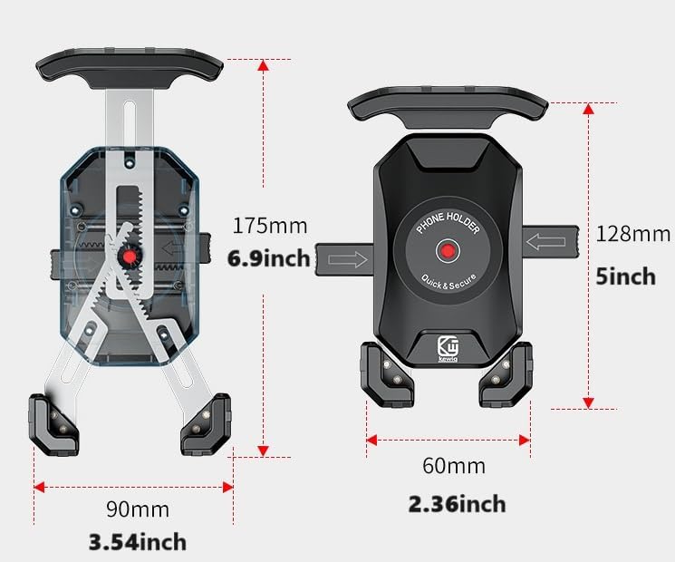 【Compatible with Phone & Handlebar Sizes】 This Motorcycle Phone Mount Holds Phones (Case Included) Dimensions: Length 5.12'' (130mm) ~ 6.89'' (175mm), Width 3.385'' (86mm) Max, Thickness 0.629'' (16mm ) Max. Compatible Handlebar Diameter: 0.5''(12mm) / 0.87''(22mm) / 1.0''(25.4mm) / 1.26'' (32mm). Suitable for installation on bike, bicycle, motorcycle, stroller, mountain bike, dirt bike, trek bike, road bike, golf cart, electric scooter, ATV, etc.