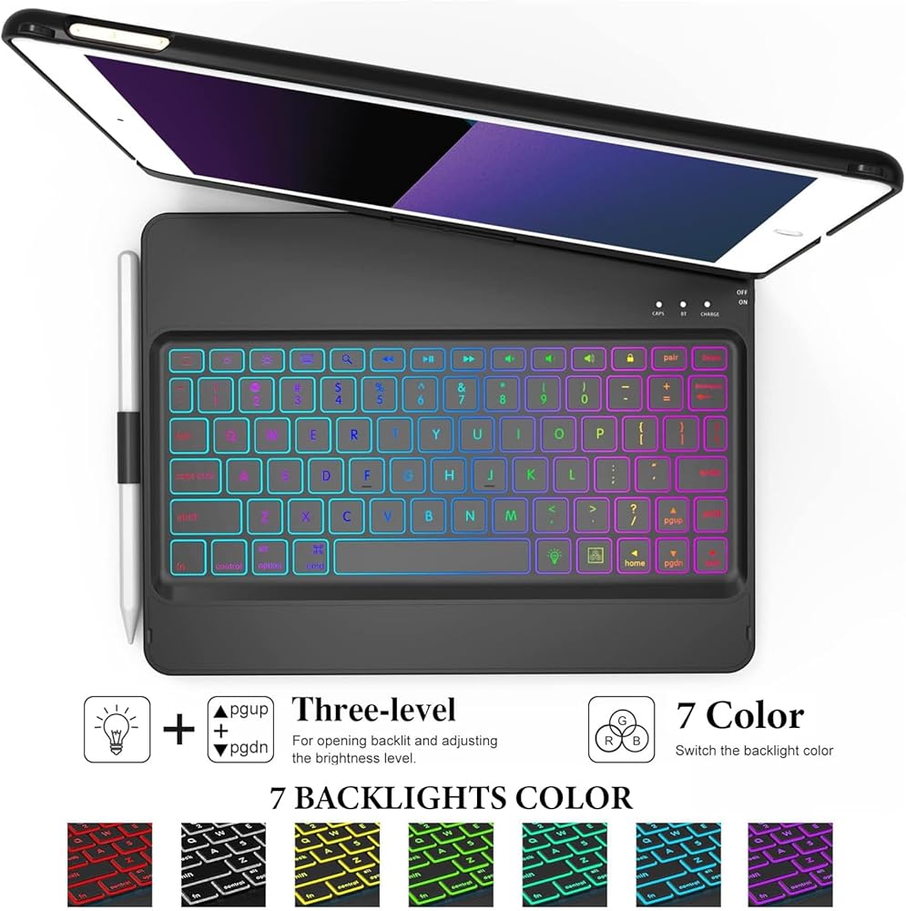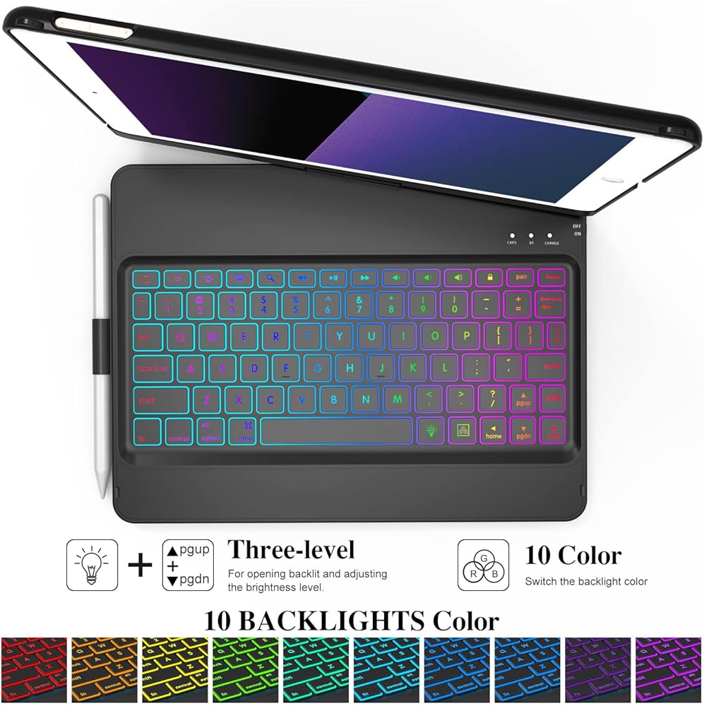 【10 Colors Backlit Keyboard】 Our keyboard's backlight is engineered for optimal light diffusion in any setting,10 color backlit with 3 brightness mode bring you different visual enjoyment and comfortable typing experience. Multiple colors give you the freedom to choose what you like.Even in dark environment, you could have no hassle to work or use your iPad.