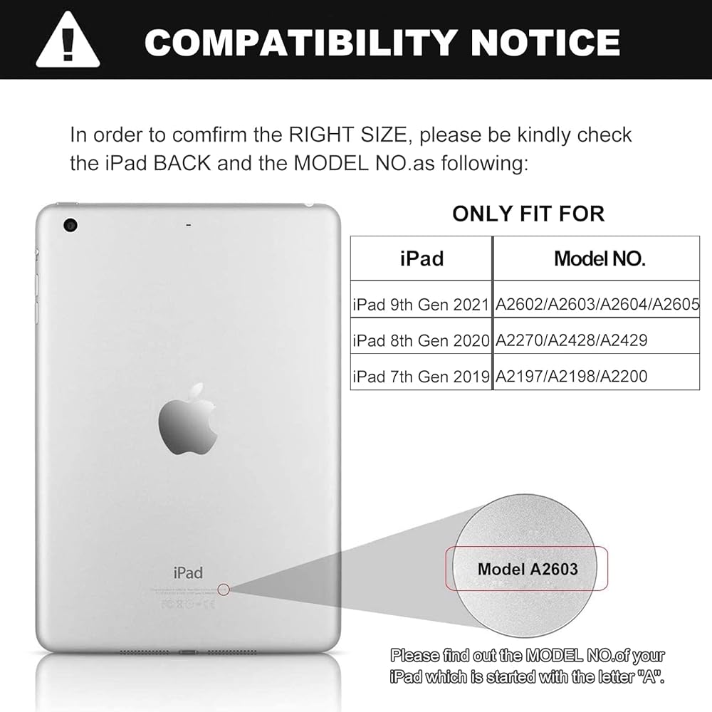 【KEYBOARD CASE WIDE COMPATIBILITY】 Wireless Keyboard Case for New iPad 9th 10.2 inch 2021(Model Number:A2602/A2603/A2604/A2605), iPad 8th Gen 2020 (A2270/A2428/A2429), iPad 7th Gen 10.2 inch 2019 (A2197/A2200/A2198). Pls check the model number on your iPad's back. Best gift for Valentine's Day, Thanksgiving Day, New Year, Christmas, School Day and wonderful gift for yourself.