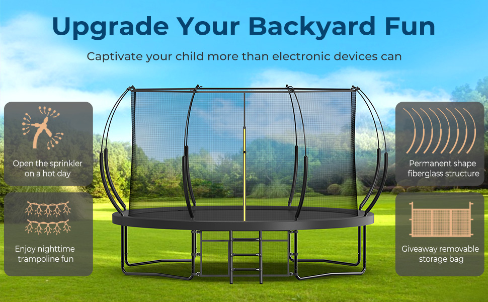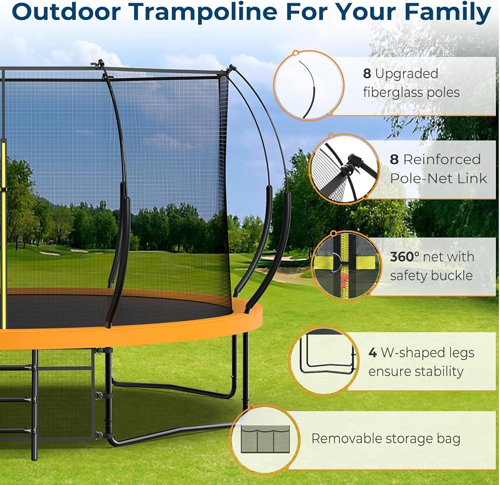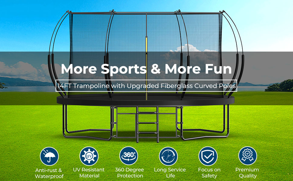 【Upgraded Fiberglass Poles】Our 14 ft trampoline with enclosure features upgraded fiberglass support poles for enhanced safety and longer lifespan. The 360° high-density safety net is secured by 8 outward-curved poles to protect your child from steel frame impacts.