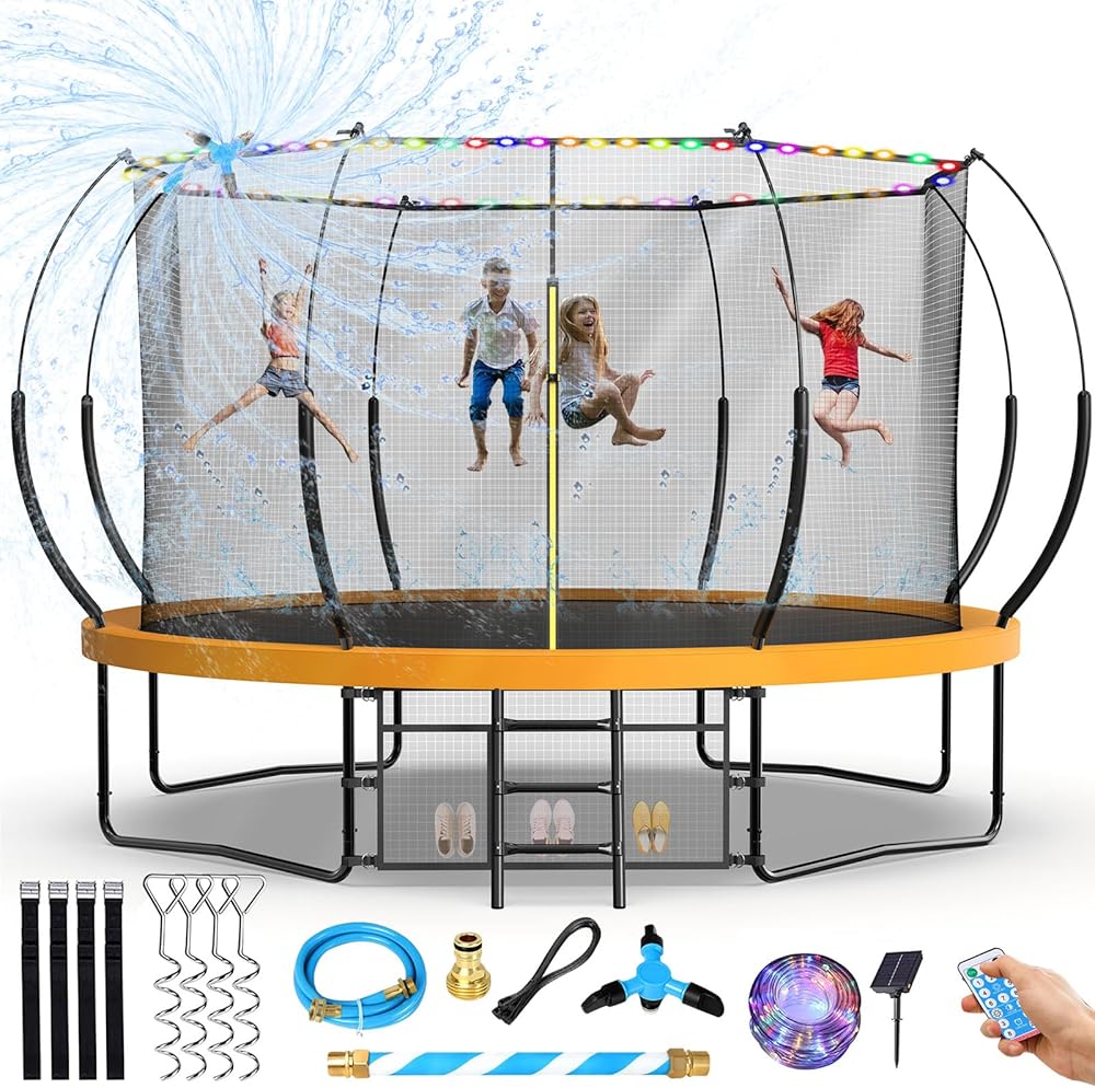 【Bonus Accessory Set】Purchase now and receive a bonus trampoline accessory set, enhancing your trampoline experience and safety. The set includes a dedicated sprinkler, solar-powered colorful lights, and wind-resistant ground anchors. Don't miss out! The trampoline will be shipped first, followed by the lights, stakes, and sprinklers 7-10 days later in a separate package.