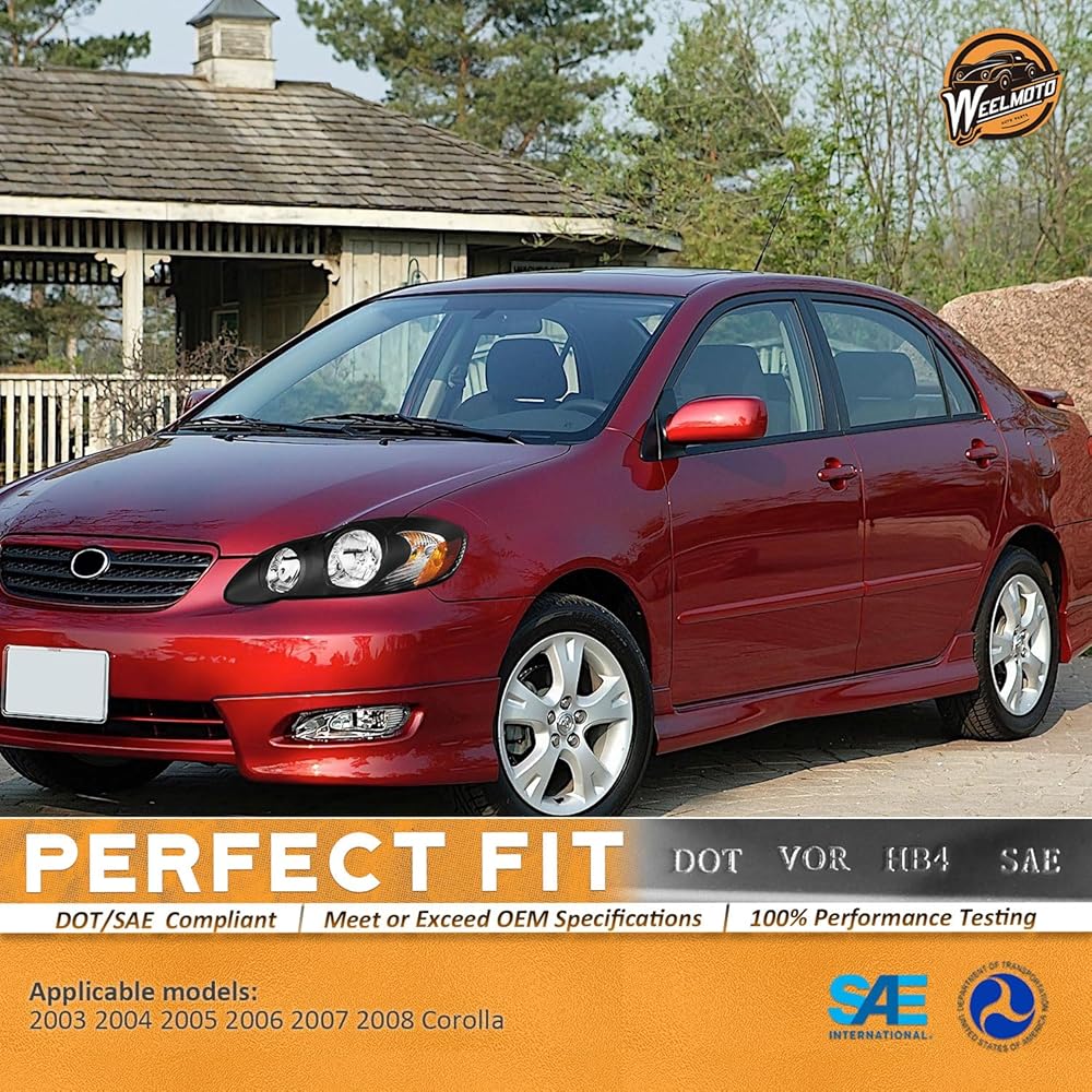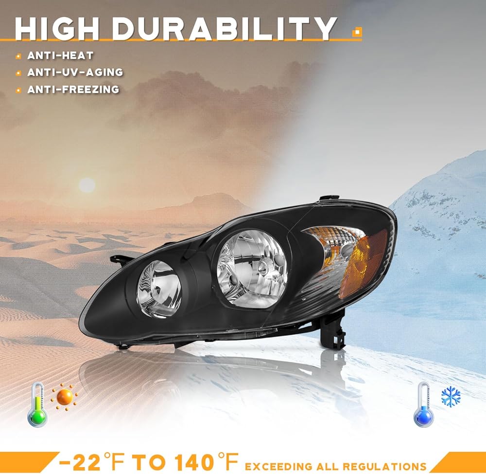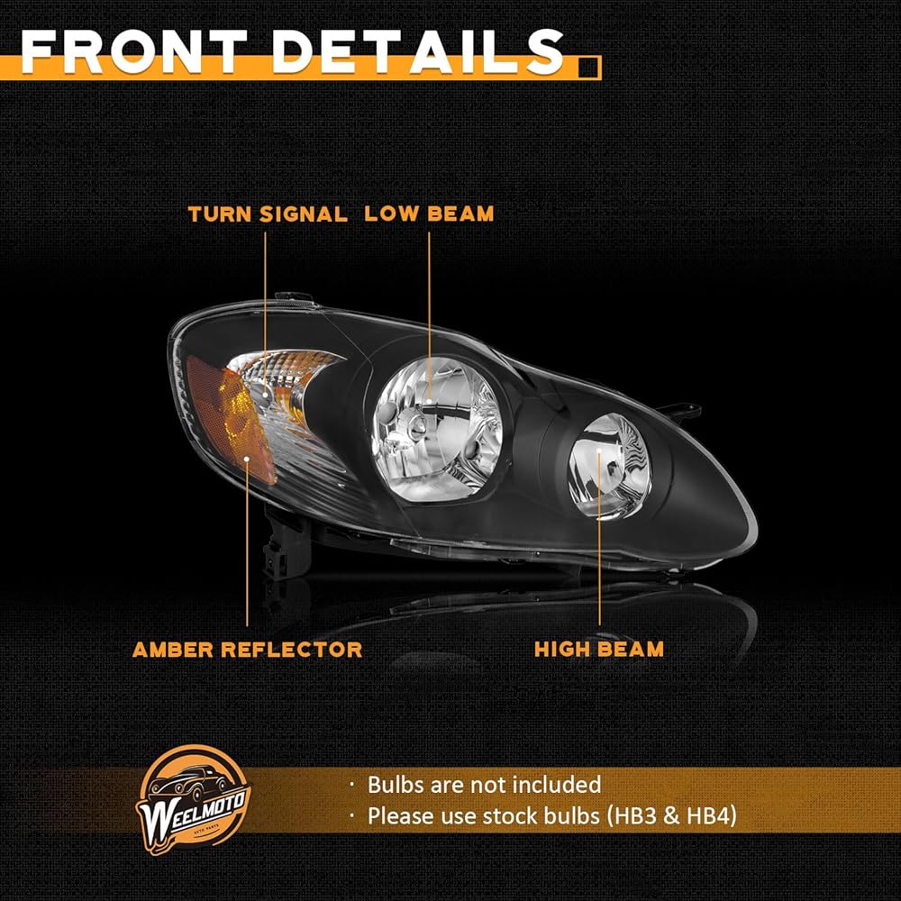 ✔️ OEM# 81150-02360, 81110-02370: Get a 100% match for your vehicle: This replacement is ideal for 𝟐𝟎𝟎𝟑 𝟐𝟎𝟎𝟒 𝟐𝟎𝟎𝟓 𝟐𝟎𝟎𝟔 𝟐𝟎𝟎𝟕 𝟐𝟎𝟎𝟖 𝐓𝐨𝐲𝐨𝐭𝐚 𝐂𝐨𝐫𝐨𝐥𝐥𝐚 𝐇𝐞𝐚𝐝𝐥𝐢𝐠𝐡𝐭 𝐂𝐡𝐫𝐨𝐦𝐞 𝐇𝐨𝐮𝐬𝐢𝐧𝐠 𝐀𝐦𝐛𝐞𝐫 𝐑𝐞𝐟𝐥𝐞𝐜𝐭𝐨𝐫 𝐋𝐞𝐟𝐭+𝐑𝐢𝐠𝐡𝐭 𝐒𝐢𝐝𝐞. Classic matte black housing: This option is glare-resistant, with an anti-dirt, modern look.Kindly note, bulbs are not included; please use stock bulbs for installation.