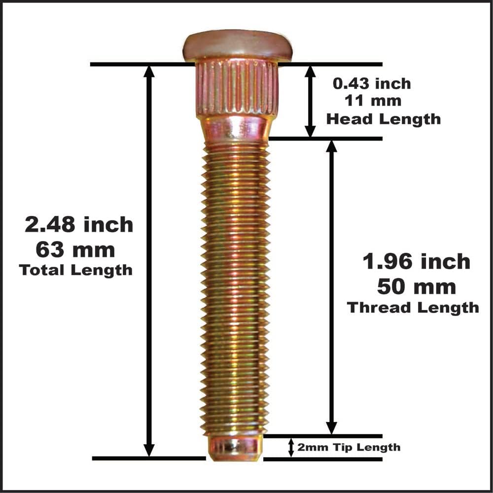 High-Strength Type Long Extended Wheel Studs. Thread Length: 50mm Shank Length Knurl Size: 14.22 mm = 0.559 Inch Thread Size: m12 x 1.5 x 50mm Bolt Type: Pin Studs Grade : 10.9 NOTES: SOLD AS 10pcs LONGER STUDS. Application compatible with : Toyota-- 86 Year 217-2020 -- Nissan 200SX 1995-1998, 240SX Front only 1995-1998, 300ZX Front only 1990-1996, 350Z 2003-2008, 370Z 2009-2020, Altima 1997-2021, Altima Front only 1993-1996, Armada Rear only 2005-2015, Cube 2009-2014, Frontier Rear only 2005-2019, GT-R 2009-2011, GT-R Front only 2012-2019, Juke 2011-2017, Leaf 2013-2020, Maxima 1995-2021, Murano 2003-2021, NV200 2013-2021, Pathfinder 2013-2020, Quest 2004-2017, Rogue 2008-2020, Sentra 1993-2020, Versa 2007-2013, Versa Front only 2014-2020, X-Trail 2005-2006. Infi-- EX35 2008-2015, EX37 2013, FX35 2003-2012, FX37 2013, FX45 2003-2008, FX50 2009-2013, G20 1999-2002, G25 2011-2012, G35 2003-2008, G37 2008-2020, I30 1996-2001, JX35 2013, M35 2006-2010, M37 2011-2013, M45 2003-2010, M56 2011-2013, Q40 2015, Q50 2014-2020, Q60 2014-2021, Q70 2014-2021, Q80 2022, QX50 2014-2020, QX56 2004-2010, QX60 2014-2020, QX70 2014-2017. Subaru -- Ascent 2019-2020, B9 Tribeca 2006-2010, BRZ 2013-2021, Crosstrek 2016-2021, Forester 2009-2021, Impreza 2008-2021, Legacy 2010-2021, Outback 2010-2021, Tribeca 2008-2014, WRX 2013-2021, WRX STI 2013-2021.