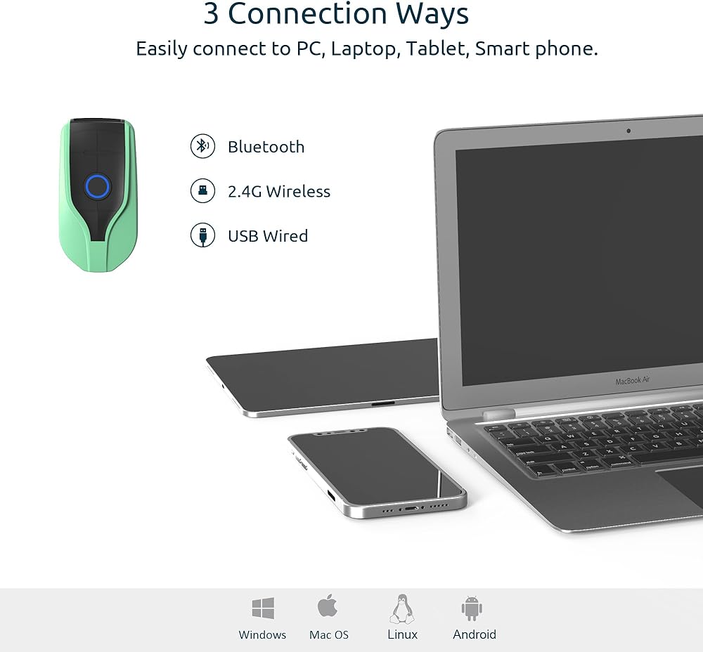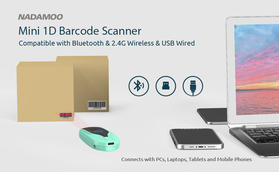 【3 in 1 Connection Design】This NADAMOO barcode scanner compatible with Bluetooth Function;2.4G Wireless connection with the include USB adapter;Wired connection.Plug and Play,no software or app installation required,easily connected with your laptop, PC, mobile phone, tablet.