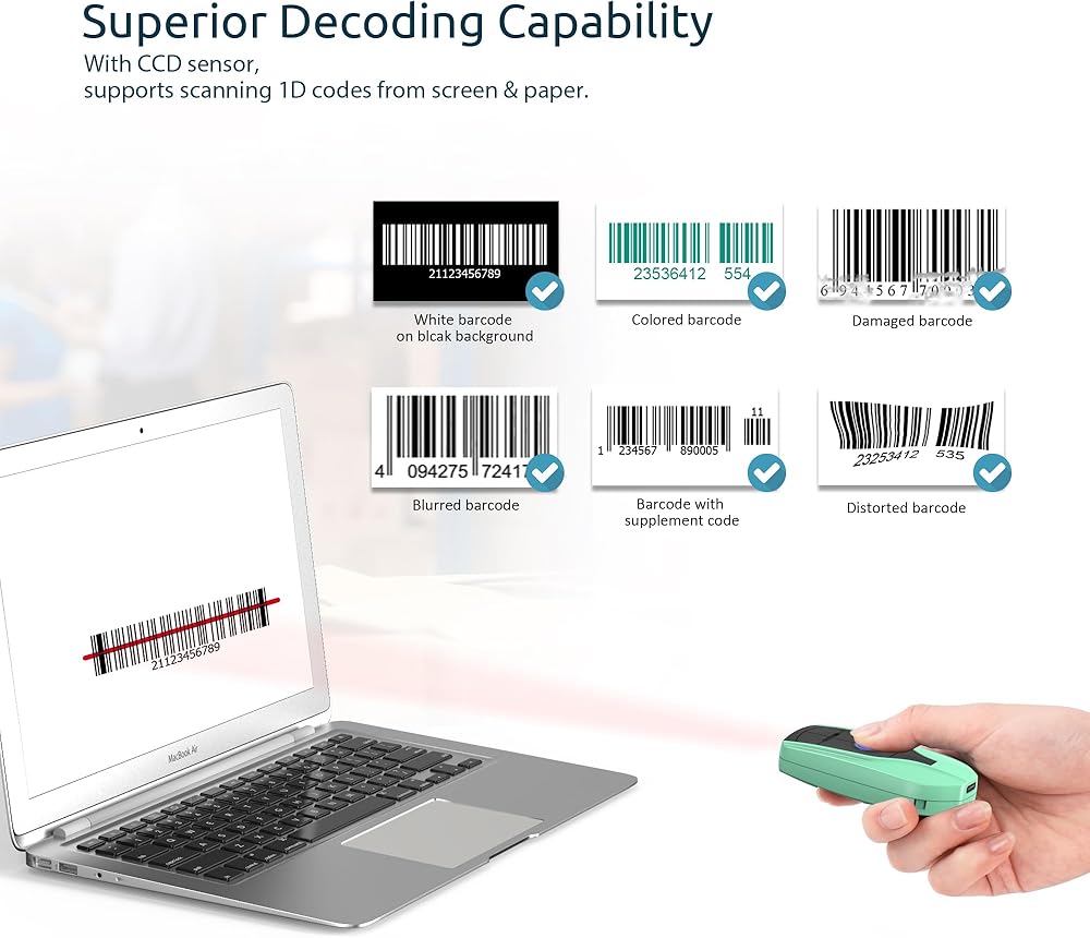 【Super Decode Capability】The imager Barcode Scanner is equipped with advanced CCD sensor, easily capture 1D bar codes on labels, paper, and mobile phone or computer displays.