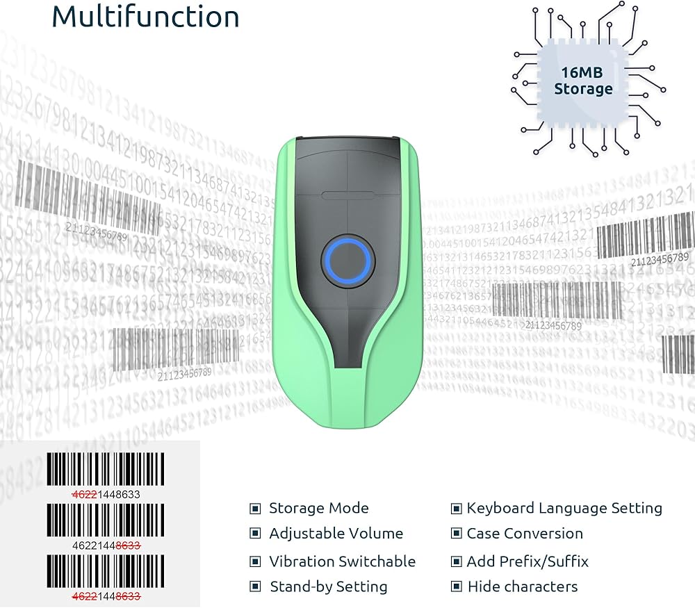 【Mini Size】The small bar code reader is light and great for carry around with you for the long haul.Anytime you want to collect data, just connect it with your device via Bluetooth or use the storage mode.