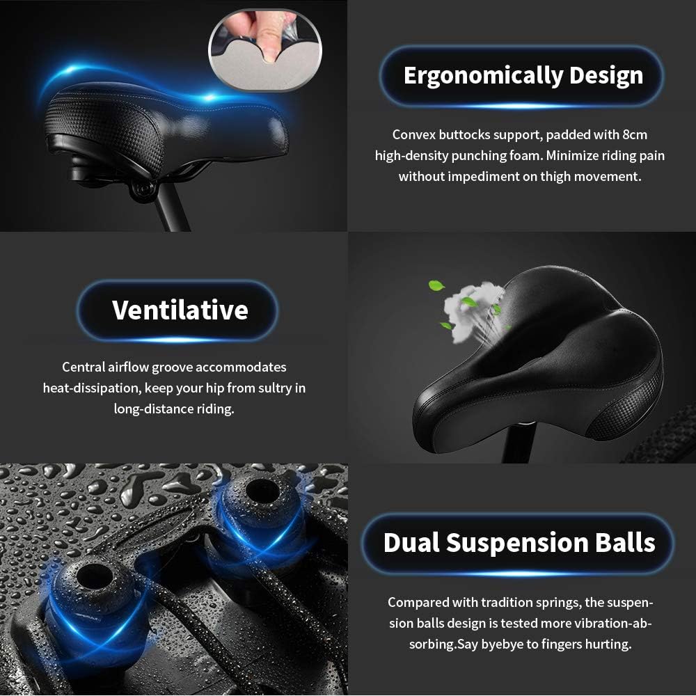Superior Material – Bluewind oversized bike seat use high elastic memory sponge that fits perfectly to the hip, durable and more comfortable. It reduces pain caused by bumps, prevents prostate and sciatica problems and brings a relaxing and pleasant riding experience.