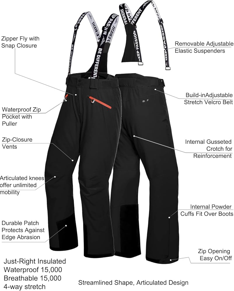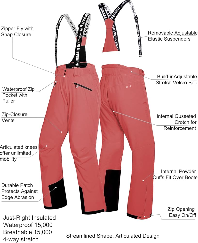 Designed to offer superior warmth, excellent performance and great mobility, articulated cut with stretch suspenders for improved mobility, stretch waist with adjustable snap for a perfect fit.