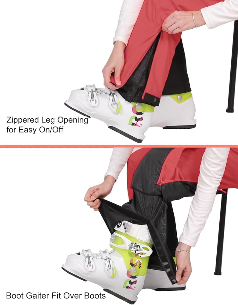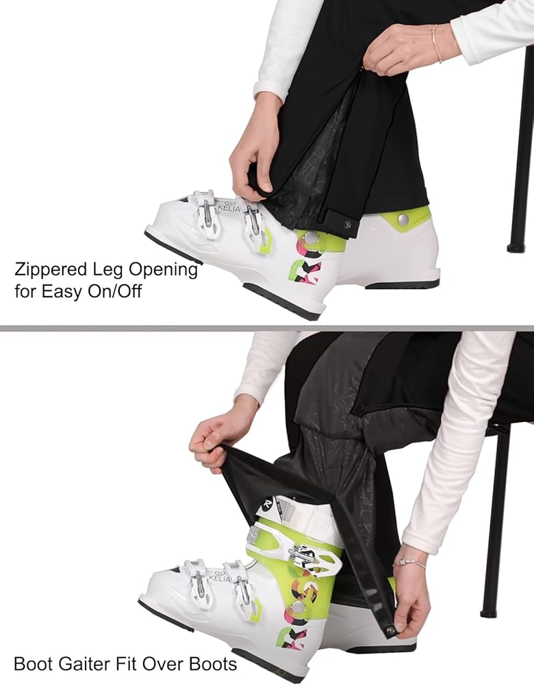 A zip at the lower leg opening makes putting on and taking off easier when skiing or hiking, boot gaiter with snap and velcro colsure to cover your ski boots to keep out cold snow and winter wind, 600 denier reinforced ankle, abrasion and hem protectors stand up to everyday wear and tear.