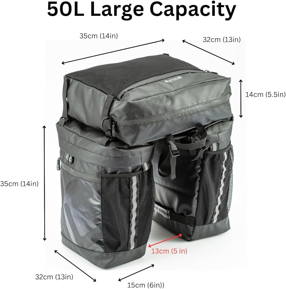 50L Bike Panniers, Water Proof Large Capacity Bags for Rear Rack Back of Bicycles Including Electric Ebike, Bike Trunk, Reflective Trims, Shoulder Bag Convertible