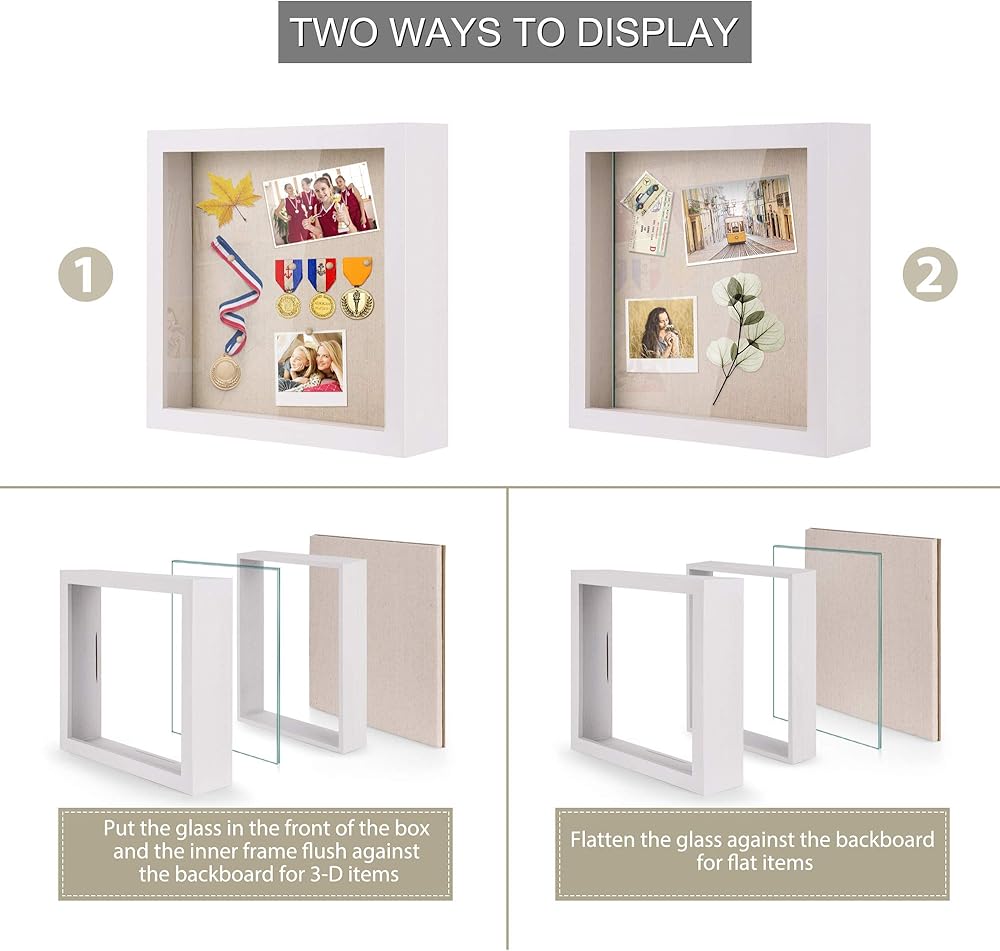 Two ways to display - Inside the shadow box frame is a removable glass and an inner frame, so you can flatten the glass against the backboard for photos and flat items, or put the glass in the front of the box and the inner frame flush against the backboard for 3-D items.