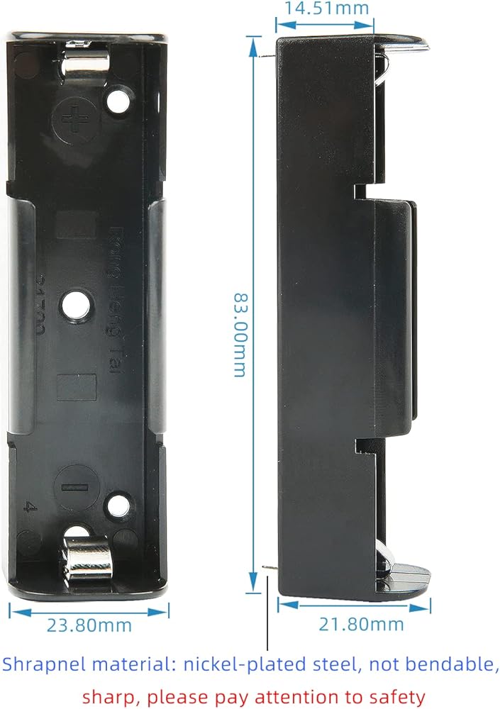 Warm Tips:Batteries are not included. It's best to use a consumer 21700 battery with a button cap.The battery holder is nickel-plated. Please avoid using it under high temperature conditions and do not bend the pins.The battery must be installed with the positive pole first, and then the negative pole! To remove the battery, you must remove it from the negative pole, and it is forbidden to remove it from the positive pole of the battery! Otherwise, there is a risk of short circuit!
