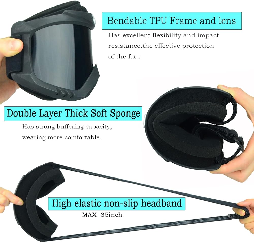 【VARIOUS COLORS FOR YOU】: There are different colors of lenses to choose from to adapt to different weather changes.Effectively Block out the lights that damage your eyes in sunny days and prevent wind and dust.The Clear goggles provide the best visibility and absorb harmful rays in overcast days.