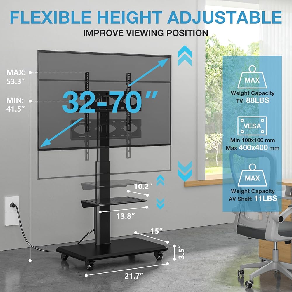 ✔️ Universal TV Stand with Wheels - The rolling tv stand can hold most LCD, LED, OLED, 4K, Smart Flat screen and Curved TV or computer monitor types ranging in size 32-70 inch weighing up to 88 lbs, fits VESA 100x100mm (4”x4”)- 400x400mm (16”x16”). The white color has good contrast against the white wall and modern tv stand matches the trim in your room. Love the low visual impact of white.