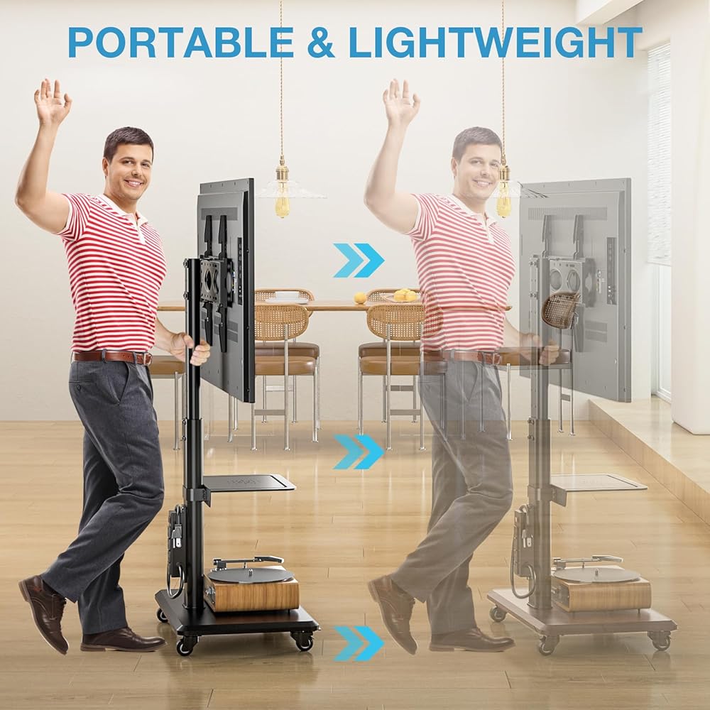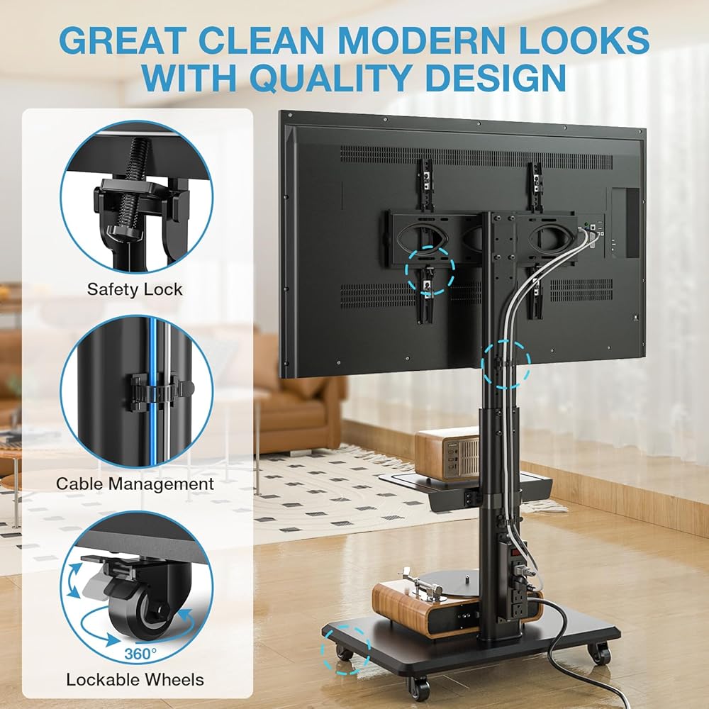 ✔️ Convenient Mobile TV Stand Move Around Easily - The smooth rolling wheels allow you to effortlessly move the TV from one room to another, making it convenient for repositioning or accommodating different viewing preferences during gatherings or parties. The locking mechanism on the wheels ensures stability when the tall tv stand is in use, providing peace of mind. Cleaning up around rolling tv cart is much better than moving a heavy television stand or entertainment center.