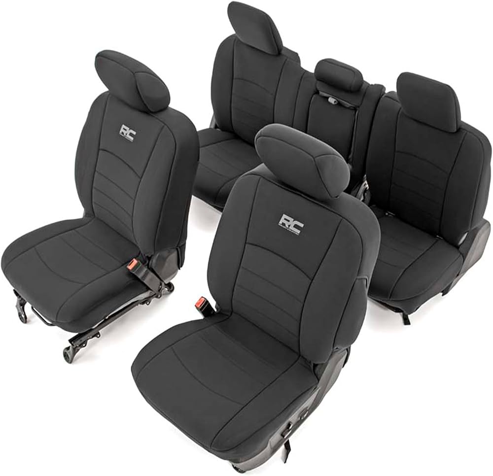 Protect your seats from water, mud, and anything you can throw at it with Rough Country's Neoprene Seat Covers. These easy-to install covers fit snugly over your seats to protect your interior from the elements while blending in perfectly. These comfortable seat covers feature a 4-layer construction with a thick foam padding for a comfortable feel and durable quality. The outer Neoprene protective layer wards off water and mildew while being soft to the touch and offering great breathability. Each cover is designed to be an exact fit on your vehicle, with accessibility for airbags, seat adjustment, and more! No tools required for this fast and simple upgrade, just slip each cover firmly over the seat and fasten with the built-in straps and you're ready to roll! Pick up a set of to save your most-used seats from additional wear and to protect your back seat from stains caused by kids or animals. Back by Rough Country for 1 Year.