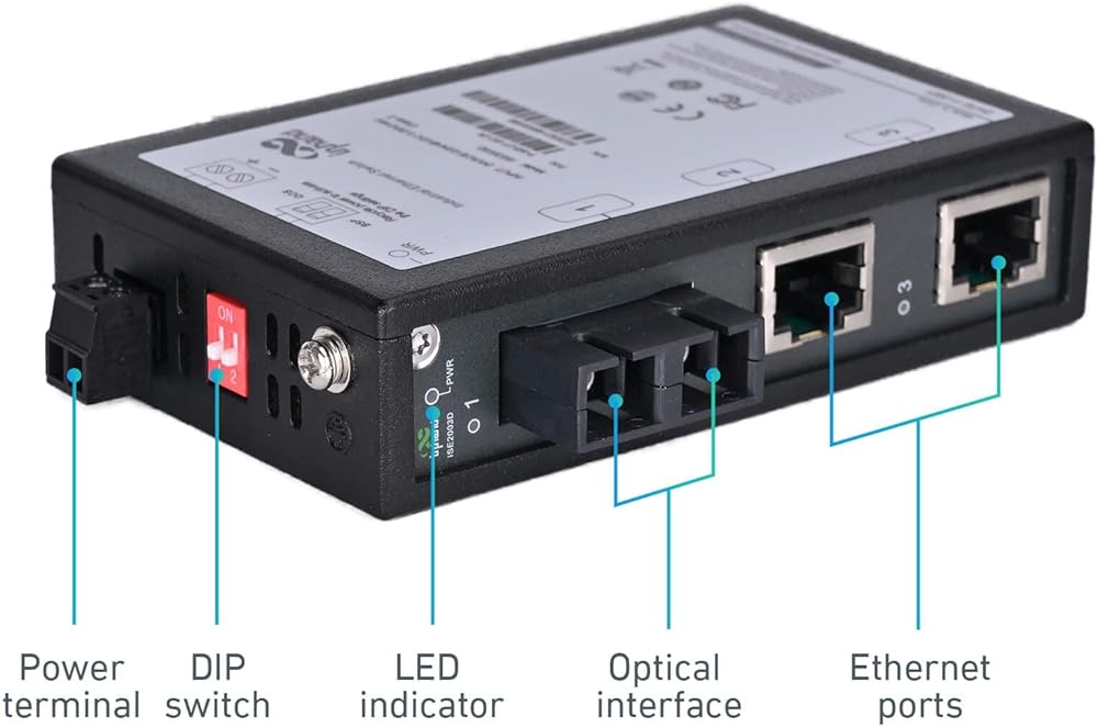 Industrial Ethernet Switch: This network switch include 2 fast Ethernet ports (2 * 10/100 Base-T(X) adaptive RJ45 ports) and 1*100Base-FX (1 * single mode dual-fiber 20km 1310 transmit-receive), support 10/100/ rate, switching capacity up to 16Gbps, Transmission Distance can reach to 20 KM.