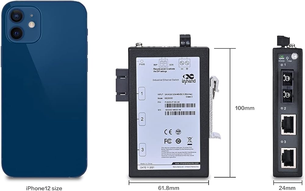 InHand Networks 3 Port Unmanaged Industrial Ethernet Switch, Media Converter, 2*10/100 Base-T(X),1*100Base-FX, Multi Mode Dual SC Fiber, Working Temperature -40° – 75°C, IP30, 2KM, UL Certification