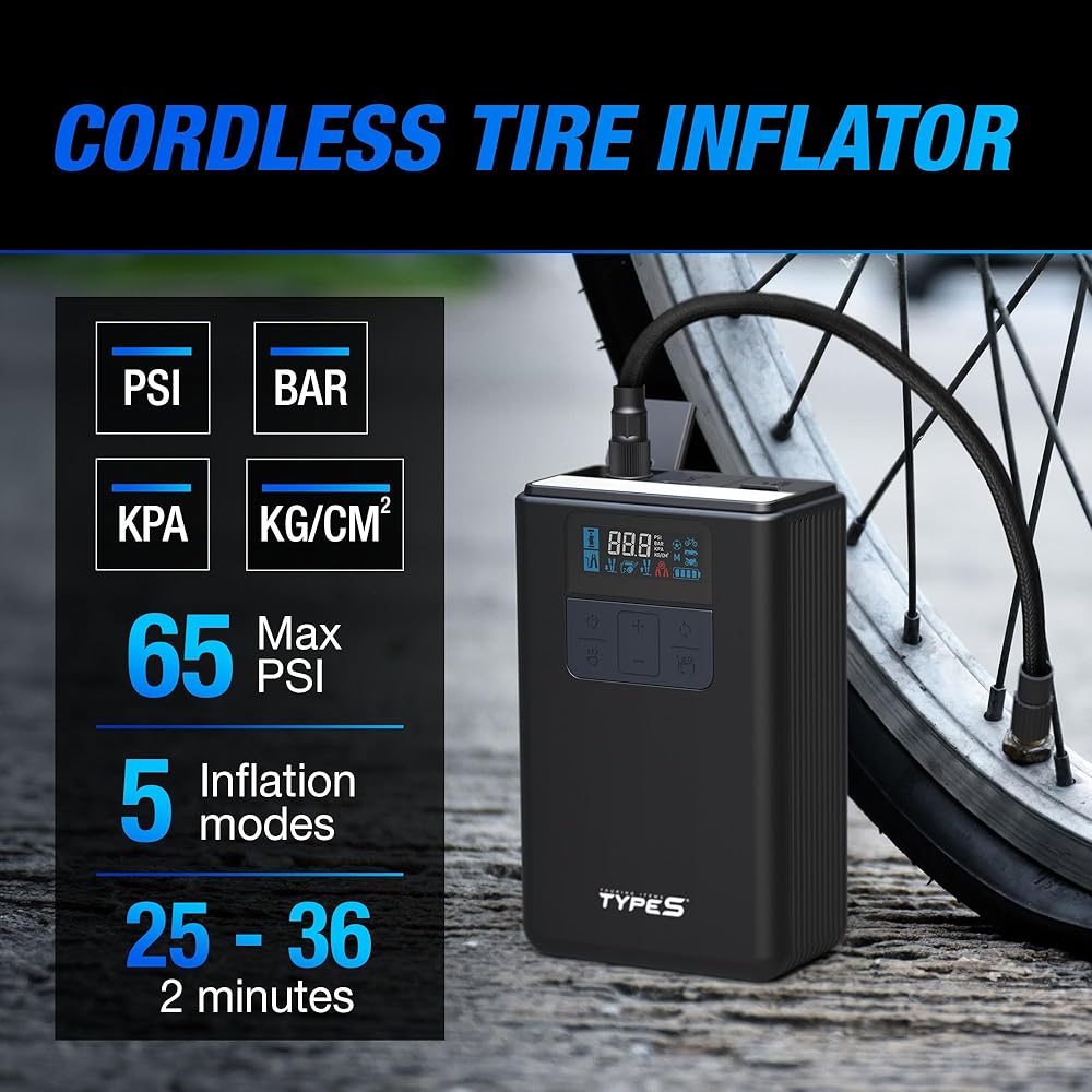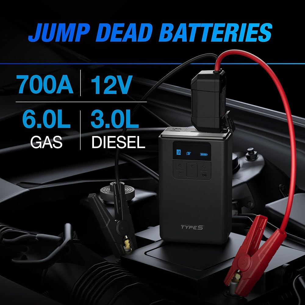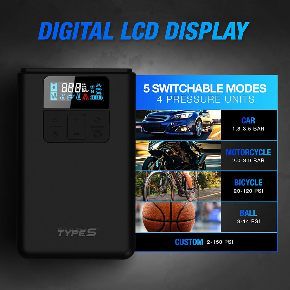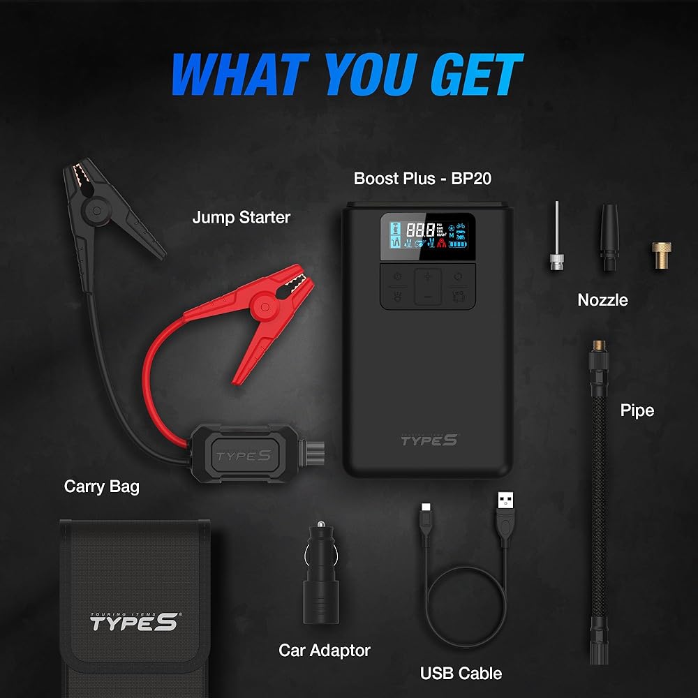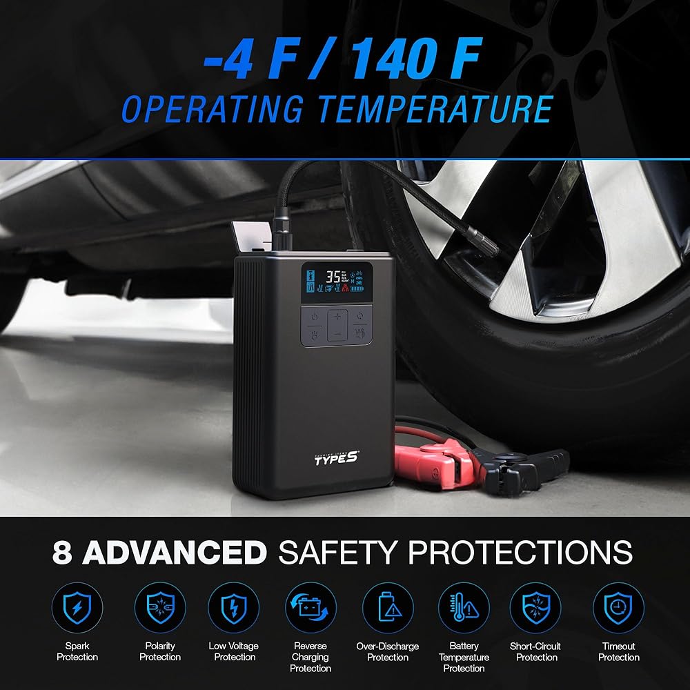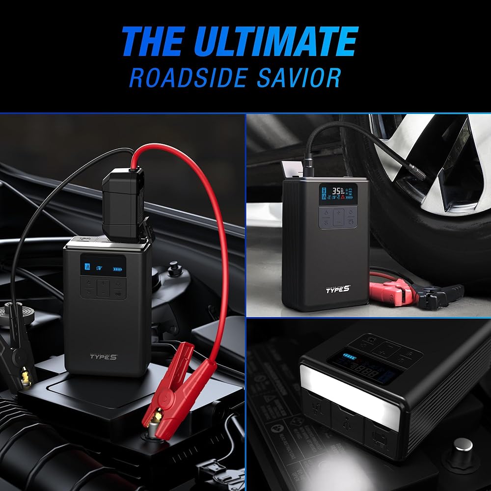 Versatile Jump Starter with Air Compressor: The TYPE S 12V Tire Inflator and Jump Starter combines the functionality of a battery jump starter and air compressor in one portable device, ensuring you're always prepared for emergencies on the road.