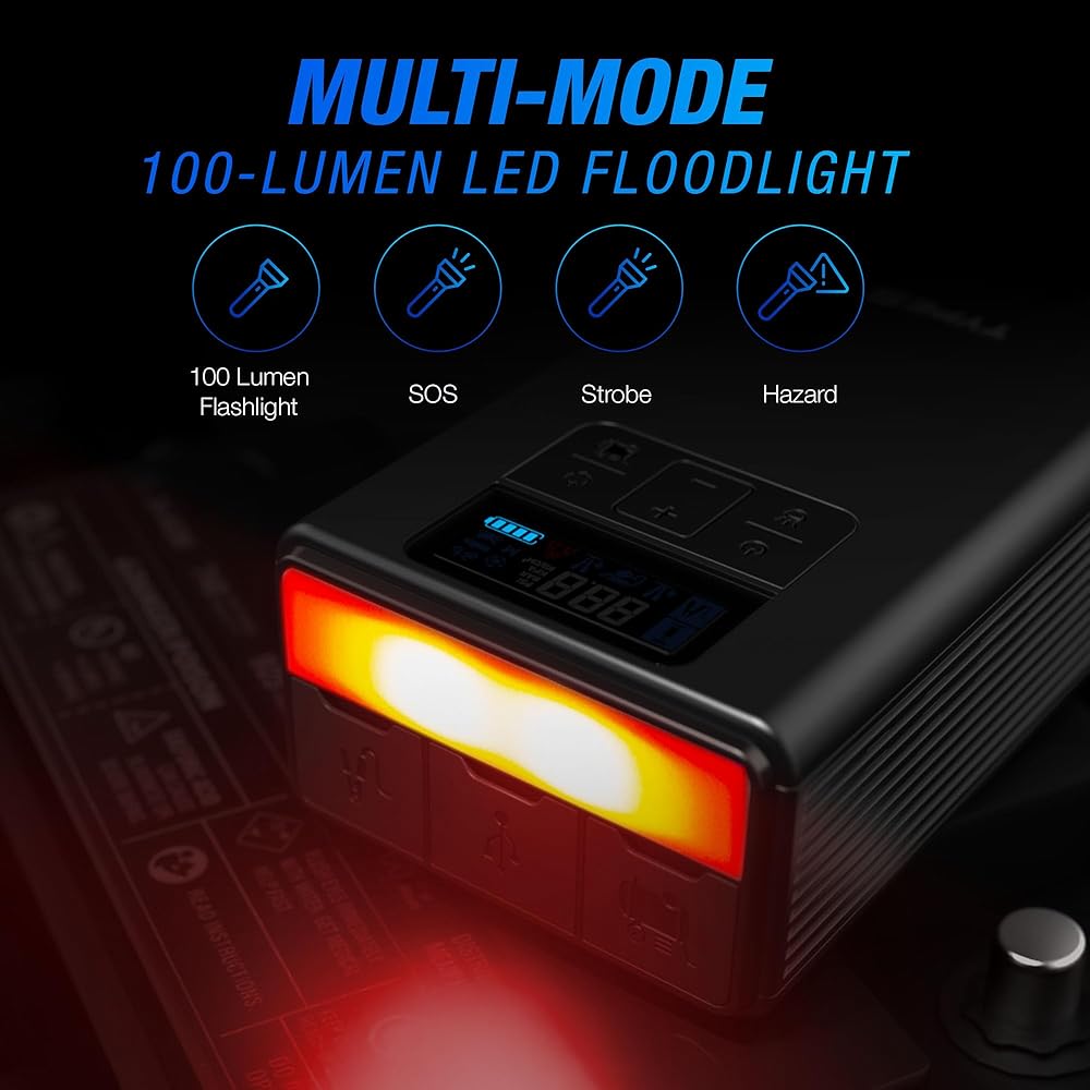 Integrated Air Compressor: Equipped with a powerful air compressor capable of inflating tires, balls, and other inflatables to a maximum pressure of 150PSI, making it an essential tool for roadside emergencies and everyday use.