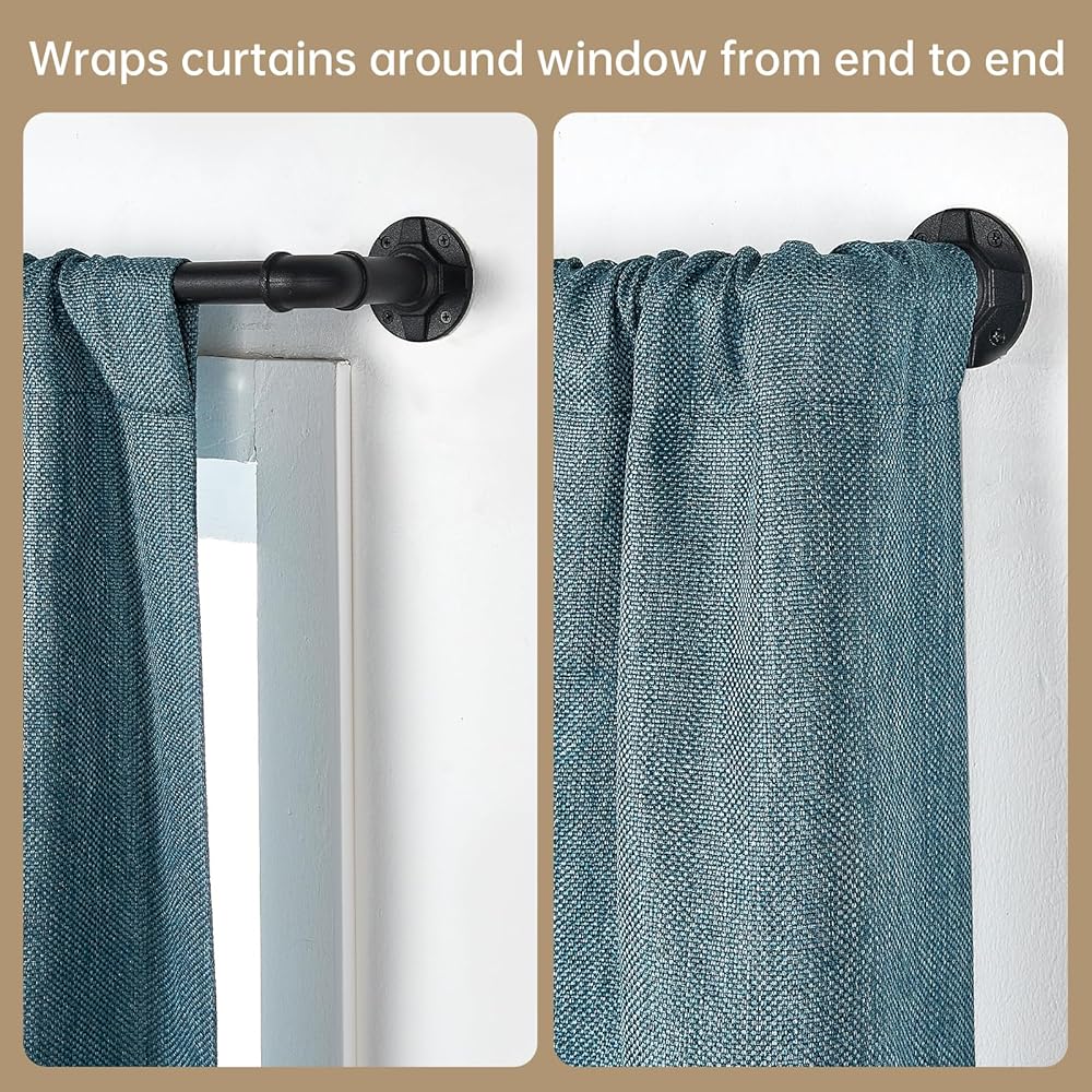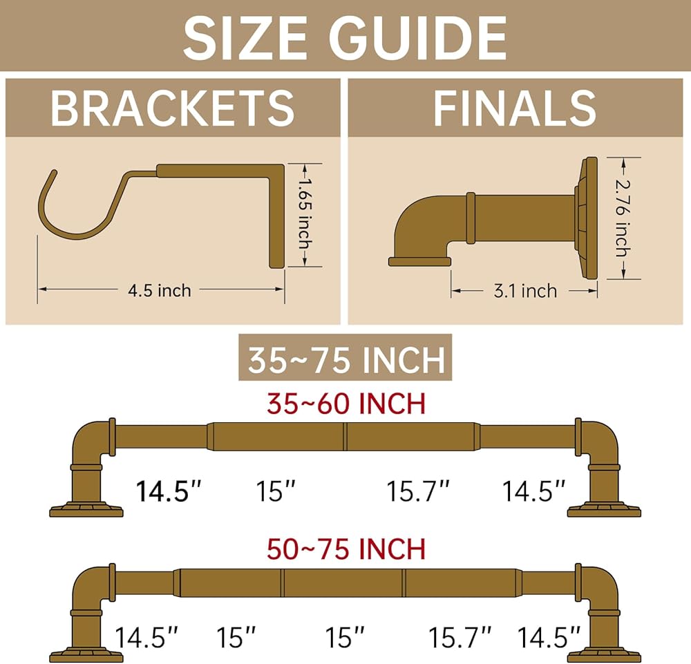 Aluminum alloy ends, steel poles and steel brackets. 1 inch rod diameter ensures handling heavy draperies up to 35 pounds. Wrap curtains around window from end to end, blocking out light while insulating the room. 1 inch diameter rod adjusts from 35 to 75 inches excluding finials and projects 3.1 inches. All dimensions are shown in the last image (Size Guide). Mounting type: Ceiling mounted and wall mounted. Comes with mounting hardware, including screws, anchors, and installation instructions.