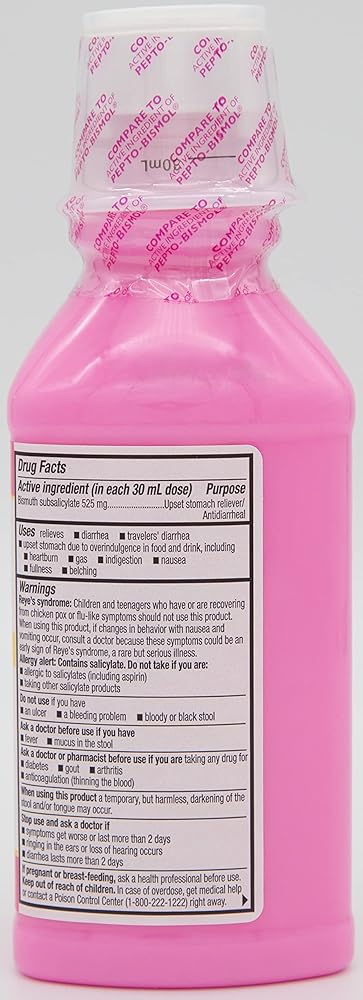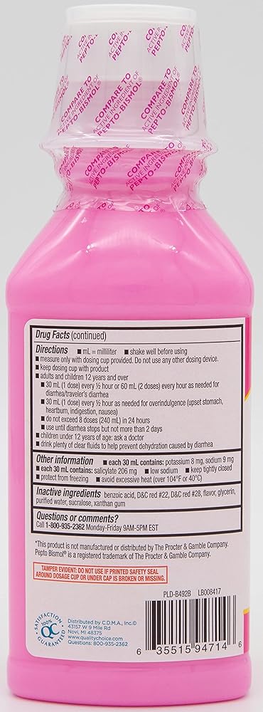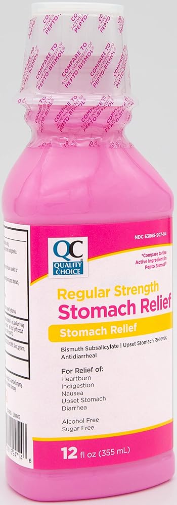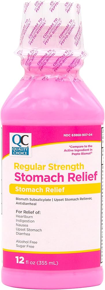 Quality Choice Regular Strength Stomach Relief is an upset stomach reliever and antidiarrheal medicine for relief of heartburn, indigestion, nausea, and diarrhea. Quality Choice Regular Strength Stomach Relief relieves upset stomach due to overindulgence of food and drink, including heartburn, gas, indigestion, nausea, fullness, and belching. With its active ingredient of 525mg Bismuth Subsalicylate in each 30ml dose, you can compare Quality Choice to that of other leading brand stomach relievers. Quality Choice Regular Strength Stomach Relief is alcohol free and sugar free. Use only as directed on package. From Quality Choice, The Brand You Trust. 100% Satisfaction Guaranteed.